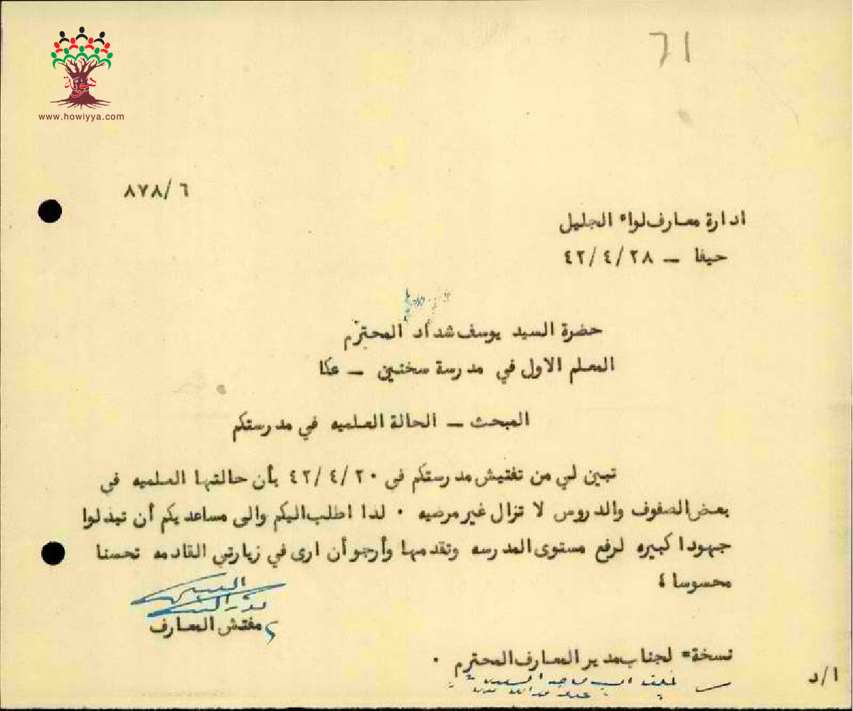 الحالة العلمية في مدرسة سخنين - رسالة من المفتش العام الى المدير يوسف شداد و المعلم ماجد السعدي - عكا