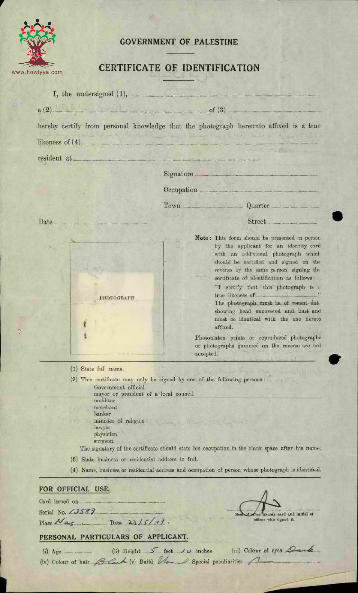 شهادة هوية عبد الله حسن حمودي موقعة من المختار محمود عثمان عام 1947