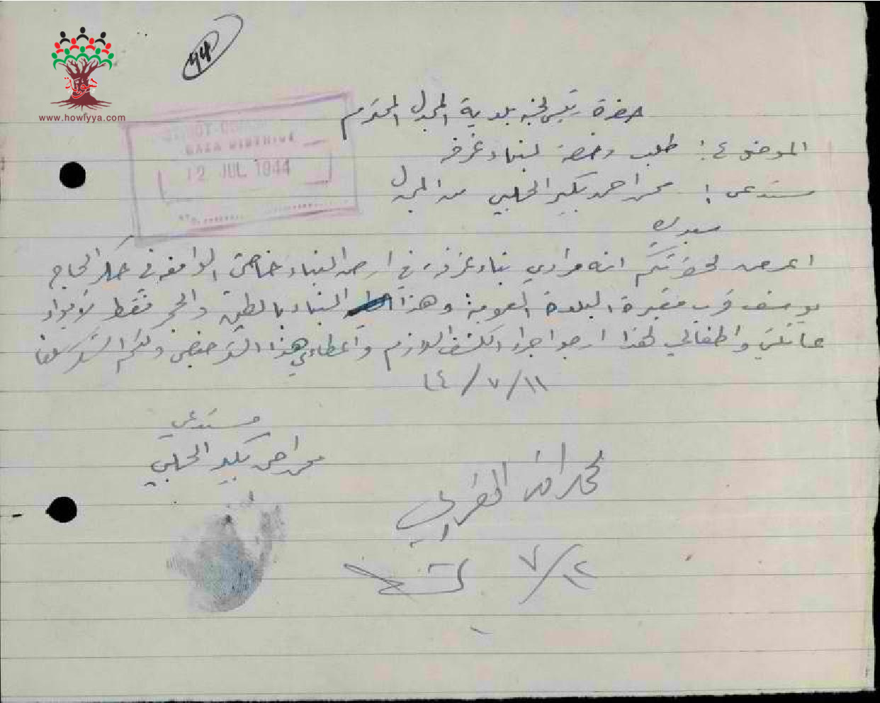 رسالة من محمد أحمد بكر الحلبي إلى رئيس بلدية المجدل يطلب رخصة بناء