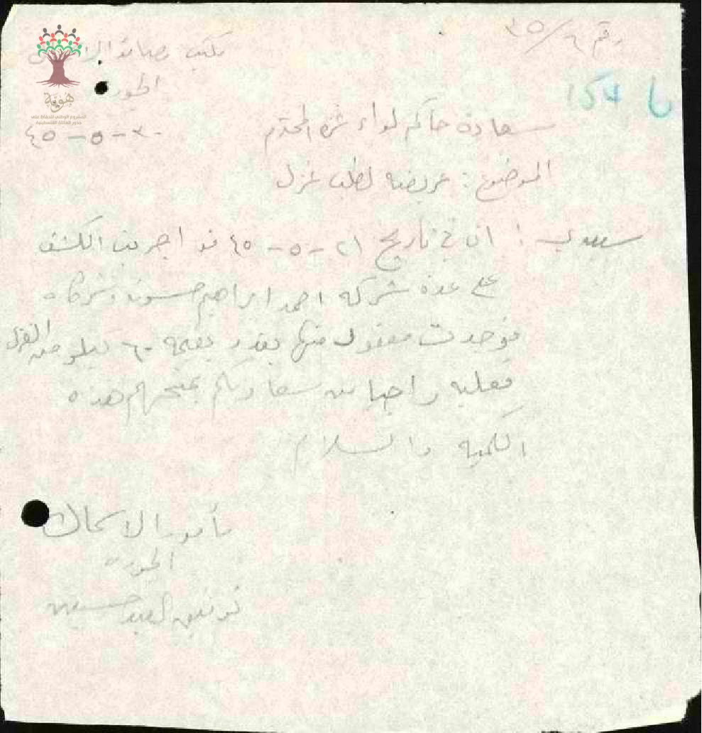 رسالة من احمد ابراهيم حسونة لمأمور أسماك الجورة يعلمه بفقدان ثلاث أرباع شباكه