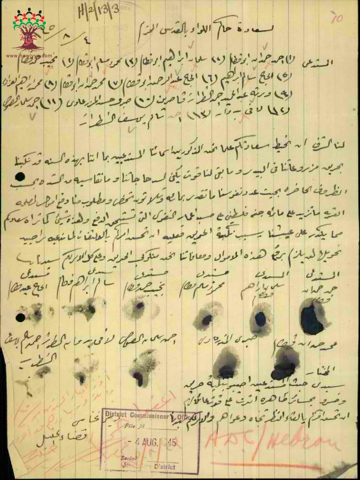 رسالة من بعض أفراد عائلة أبو قطام إلى مساعد حاكم لواء الخليل يطلبةن اعفائهم من ضريبة مصلحة القرية بسبب ضيق الحال بعد حريق أراضيهم