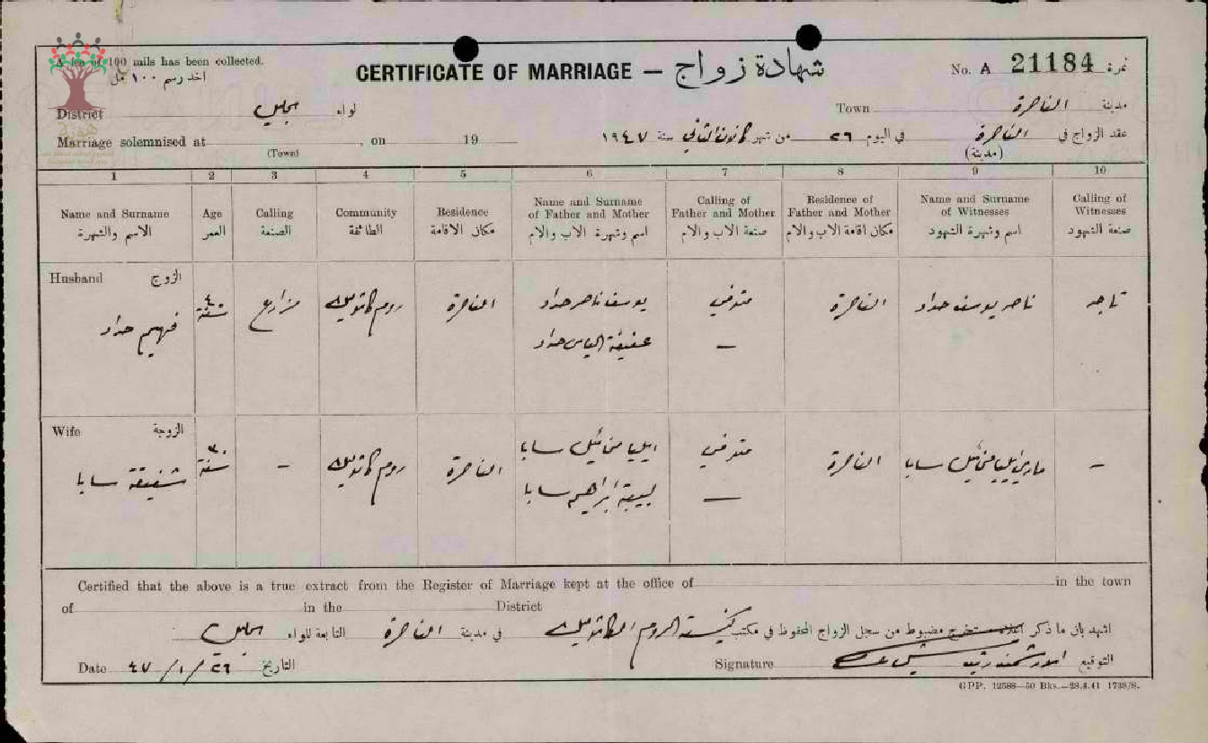عقد زواج فهيم حداد و شفيقة سابا