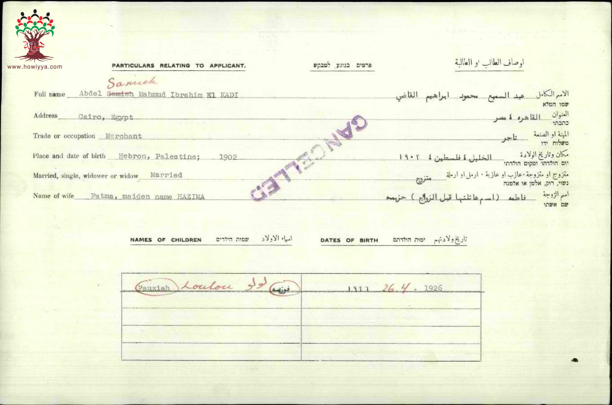 شهادة الجنسية الفلسطينية ل عبد السميع القاضي
