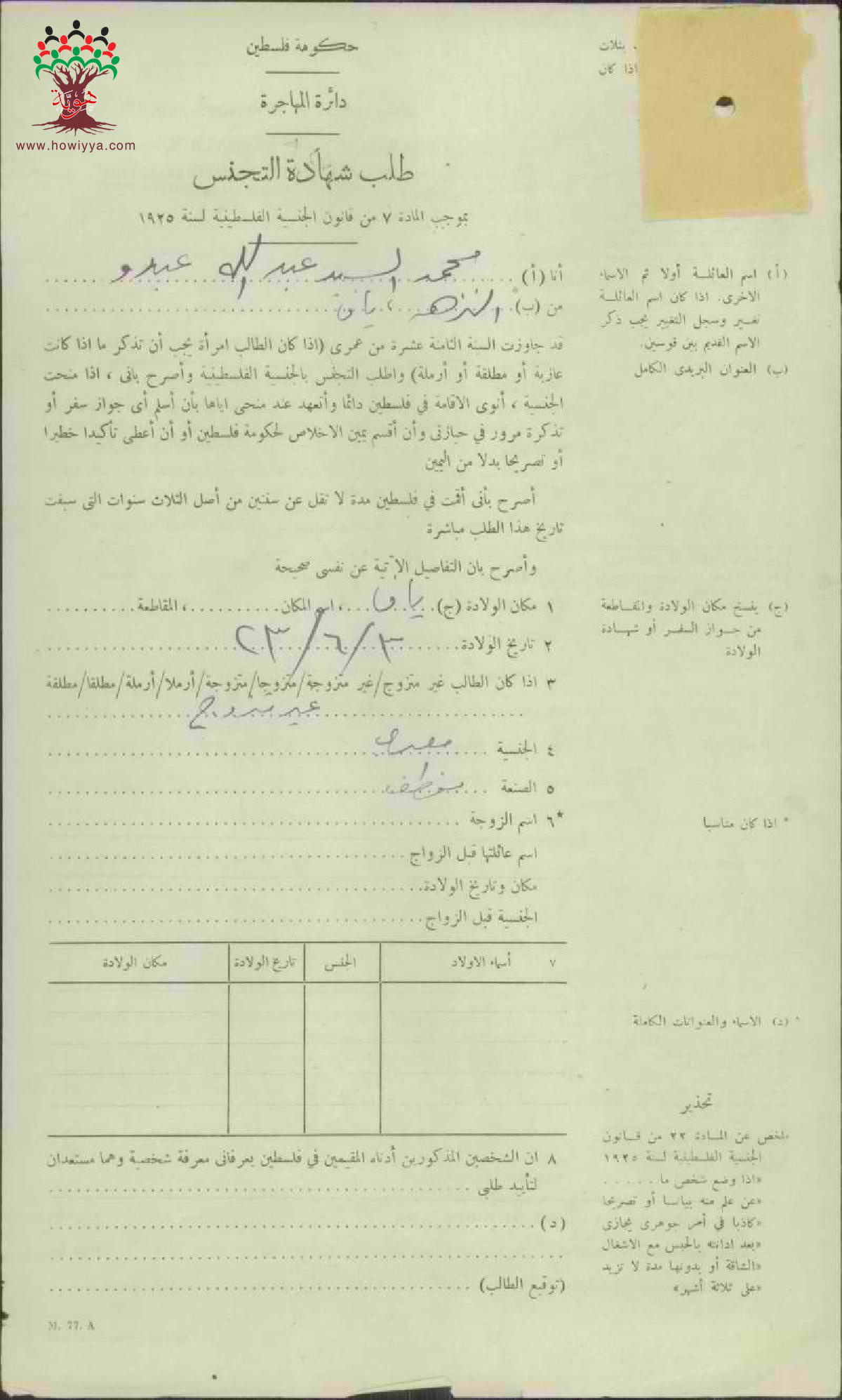 طلب الجنسية الفلسطينية-محمد عبده-يافا/مصر