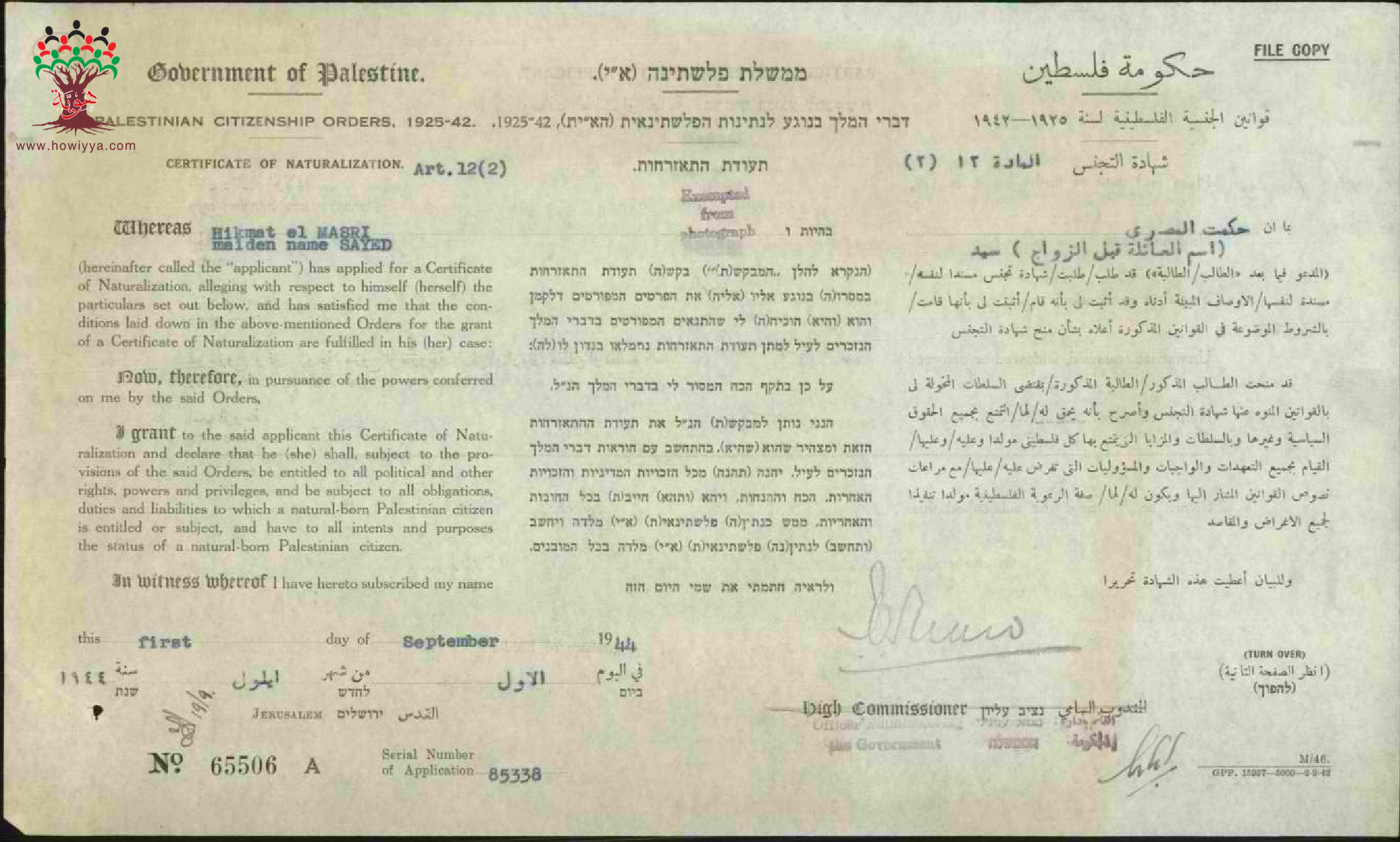 شهادة الجنسية الفلسطينية ل حكمت سيد المصري