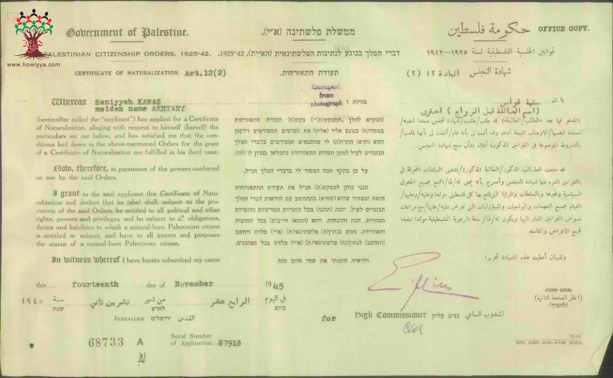 شهادة الجنسية الفلسطينية ل سنية قواس