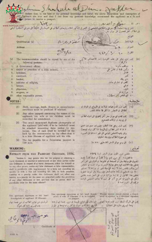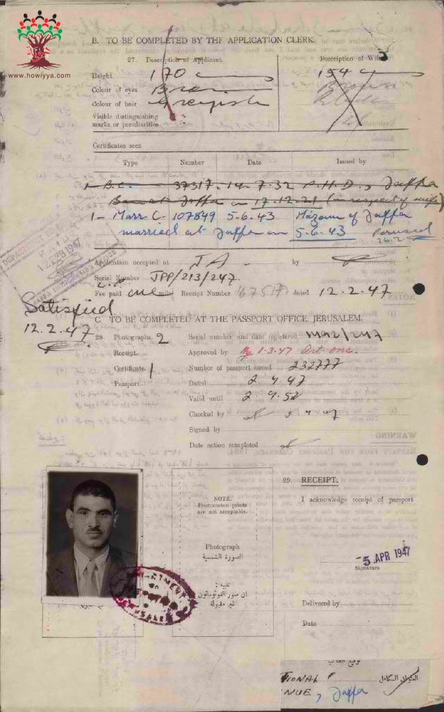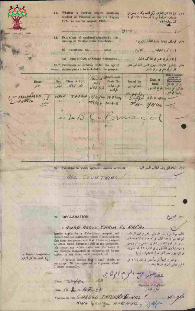 طلب جواز سفر فلسطيني - عوض عبد الكريم الرفاعي - يافا