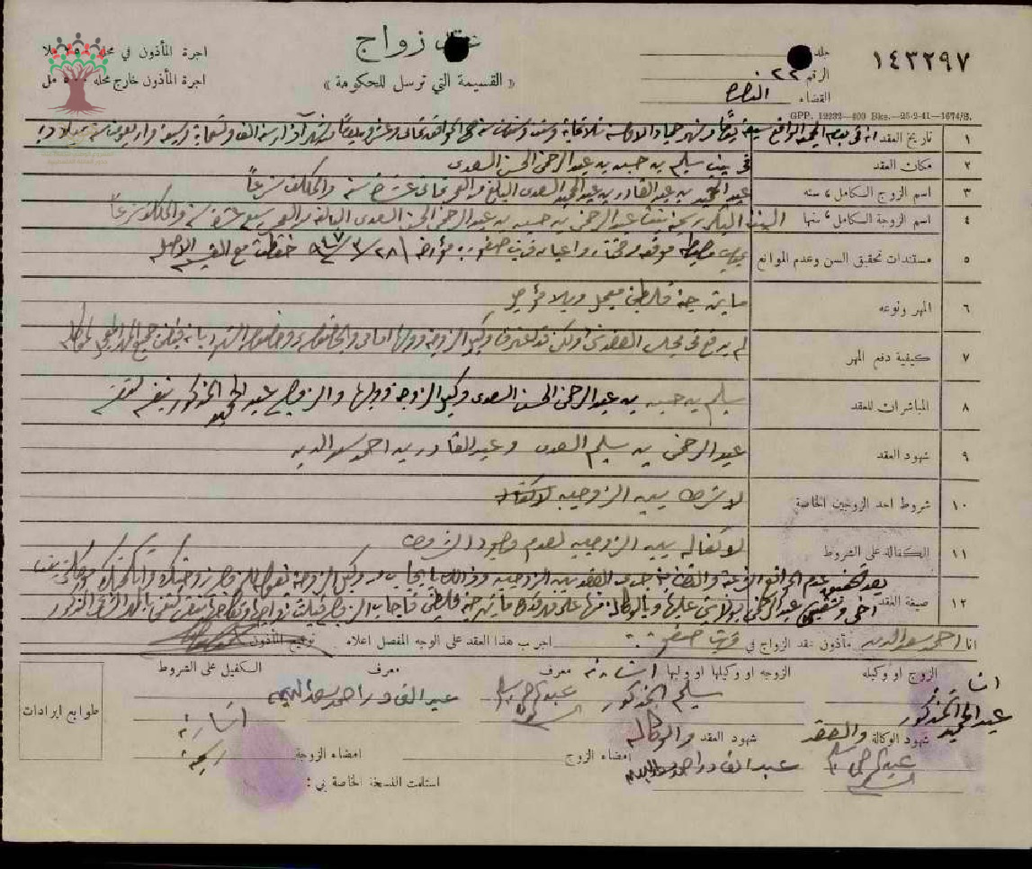 عقد زواج عبد الحميد عبد القادر السعدي و رسمية عبد الرحمن السعدي