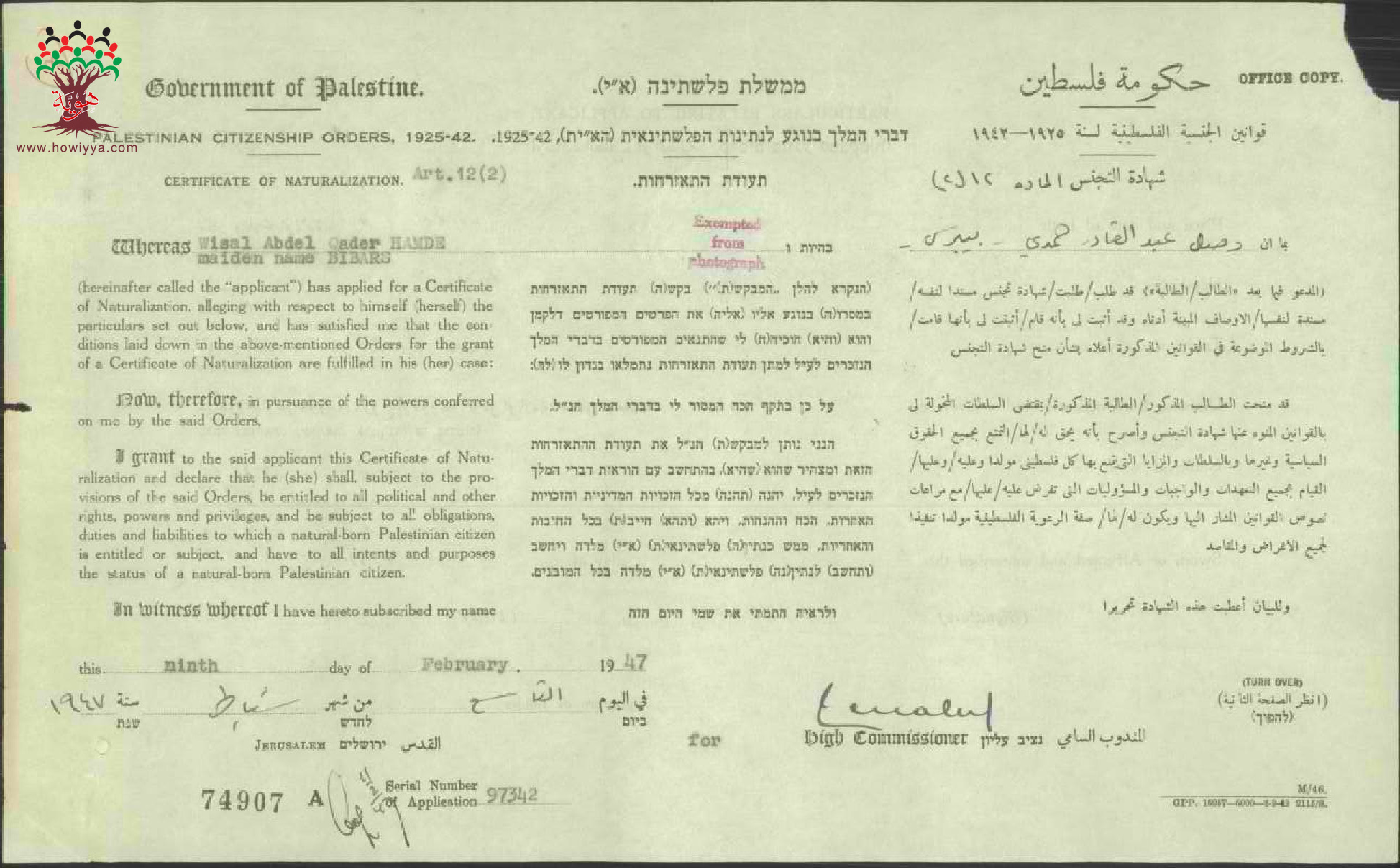 شهادة الجنسية الفلسطينية - وصال حمدي
