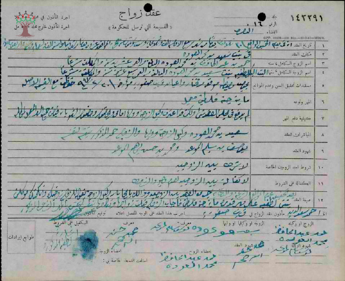 عقد زواج أحمد عبد الحافظ العودة و لطفية سعيد العودة