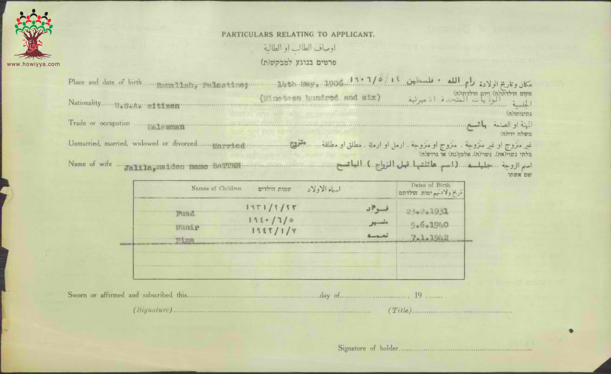 شهادة الجنسية الفلسطينية - سالم شحادة الباتح