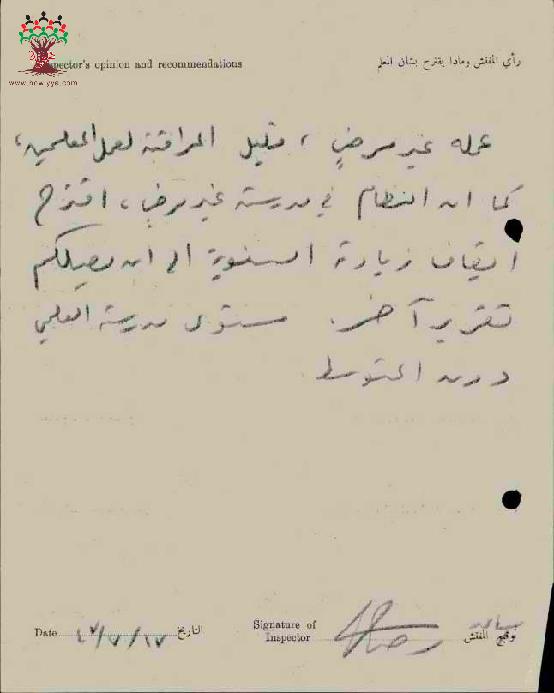 تقرير تفصيلي عن أداء المعلم عبد الوهاب الدجاني في مدرسة البصة سنة 1947