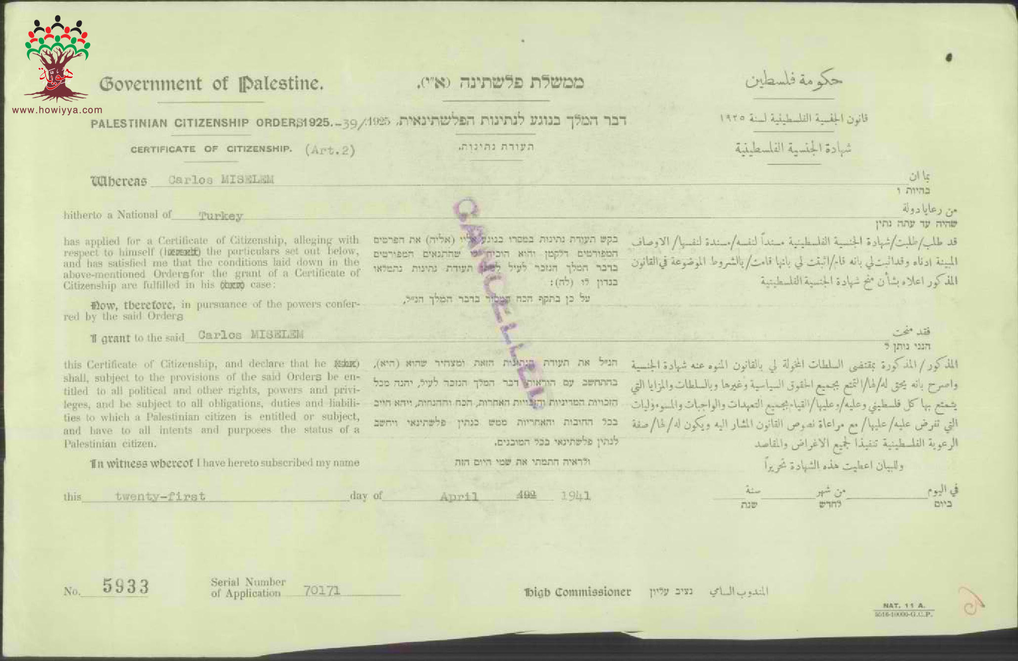 شهادة الجنسية الفلسطينية لكارلوس مسيلم