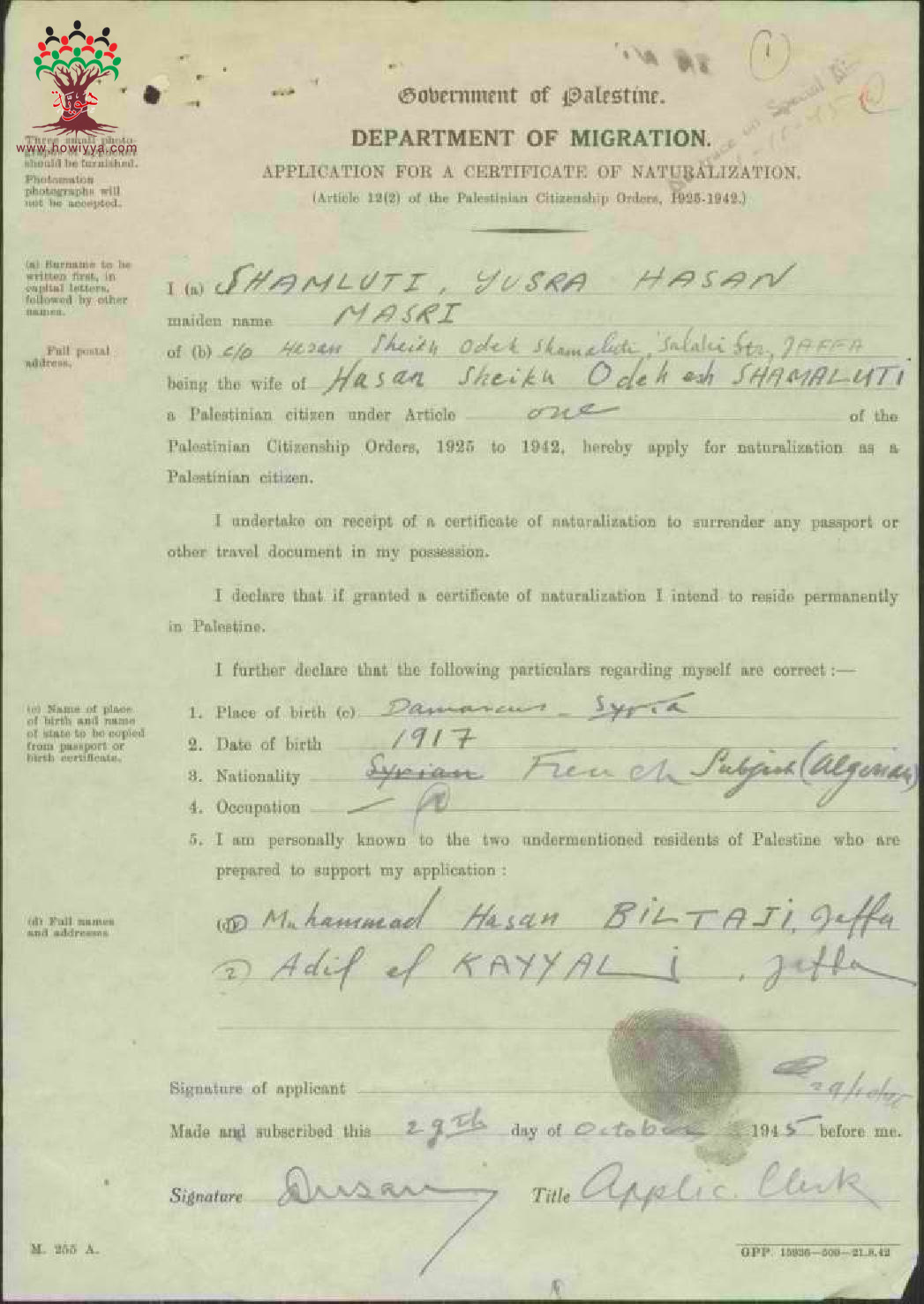 طلب الجنسية الفلسطينية - يسرى حسن شملوطي - يافا