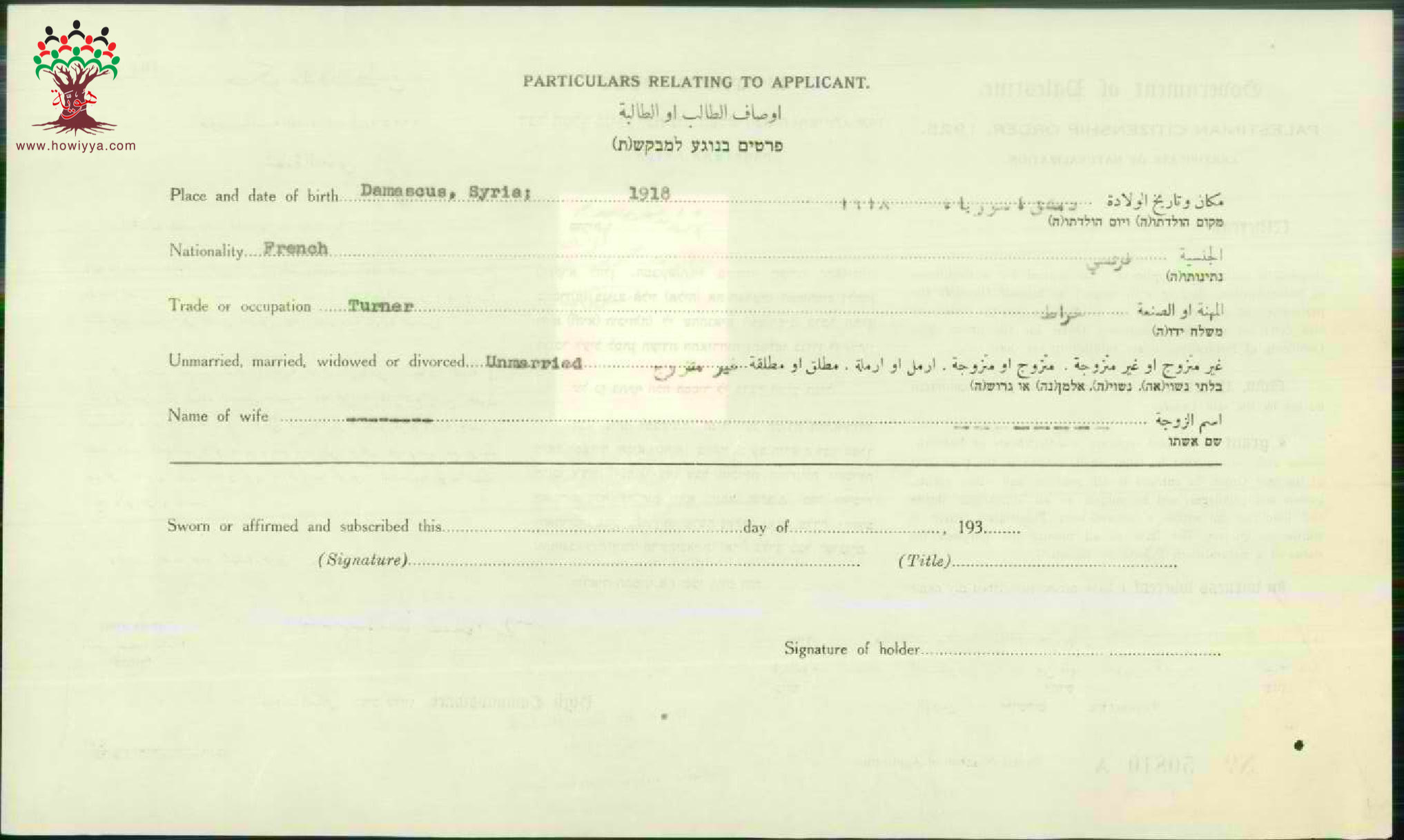 شهادة الجنسية الفلسطينية لفخري الدين محمود الزيناتي