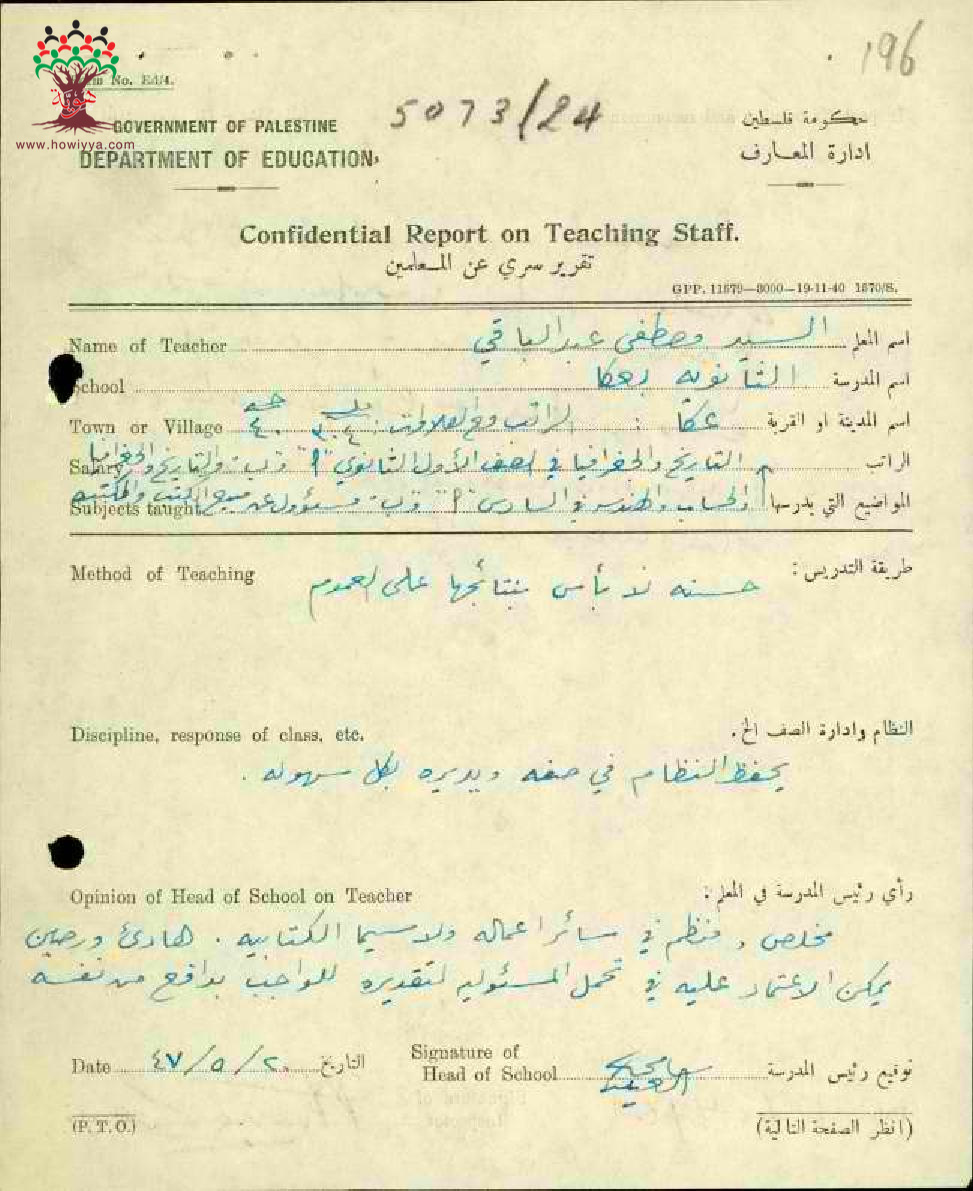 تقرير تفصيلي عن أداء المعلم مصطفى عبد الباقي في مدرسة عكا سنة 1947