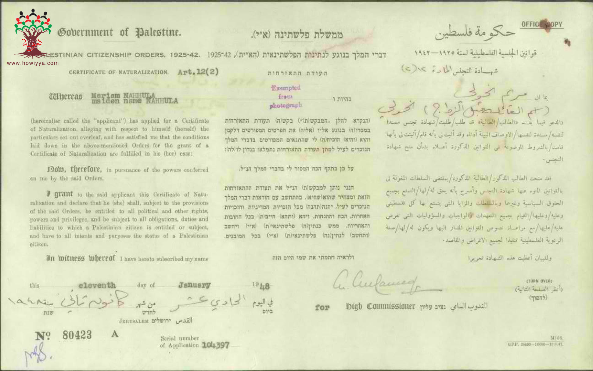 شهادة الجنسية الفلسطينية لمريم نحولي