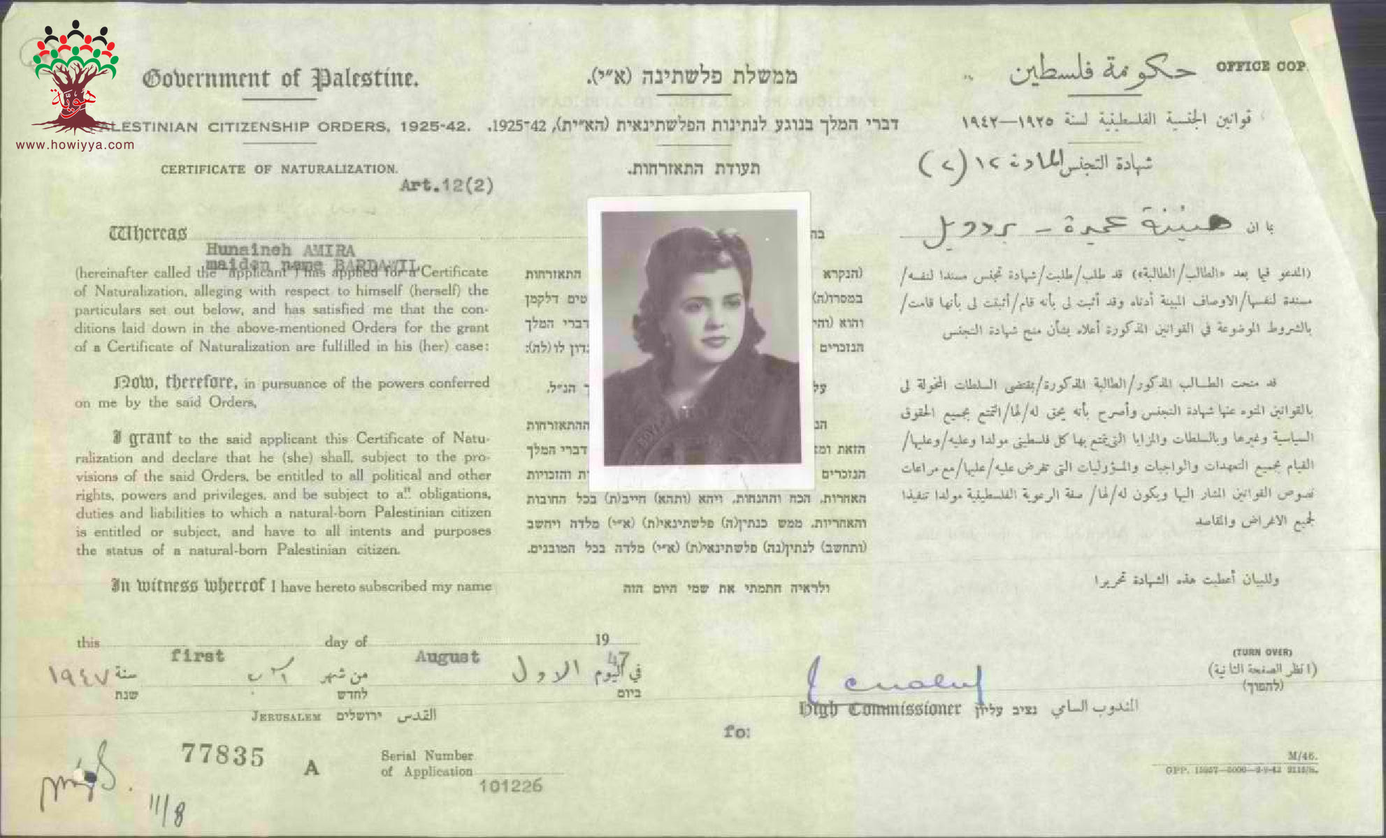 شهادة الجنسية الفلسطينية لحنينة عميرة (بردويل )