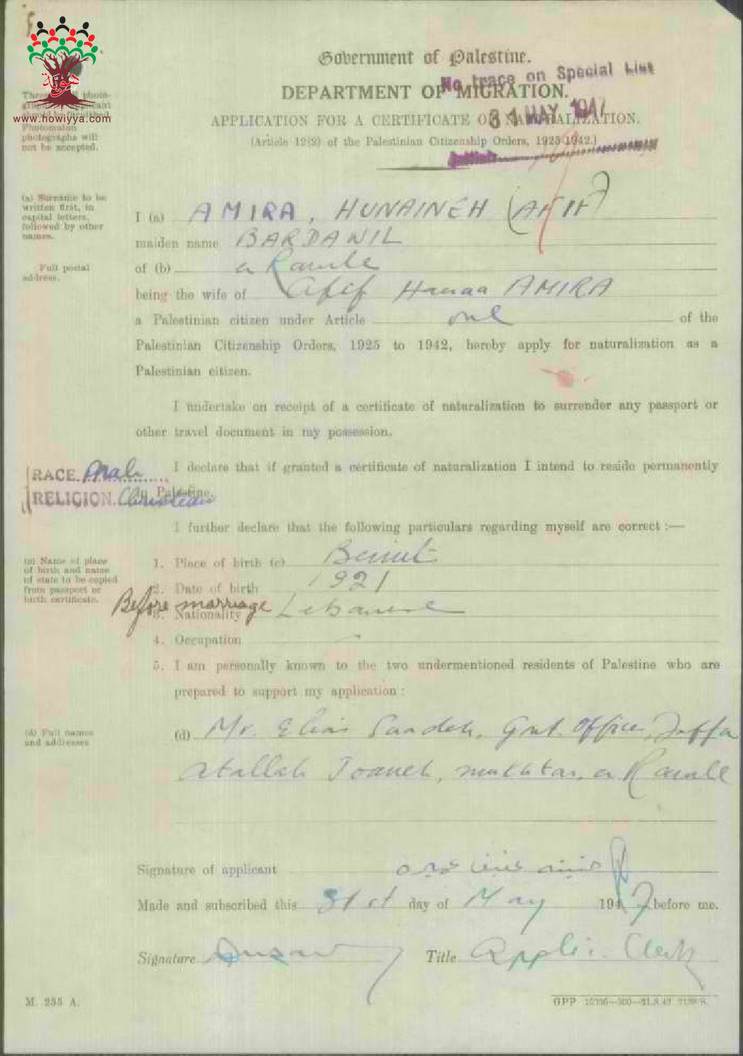 طلب الجنسية الفلسطينية - حنينة عميرة (بردويل) - يافا /بيروت