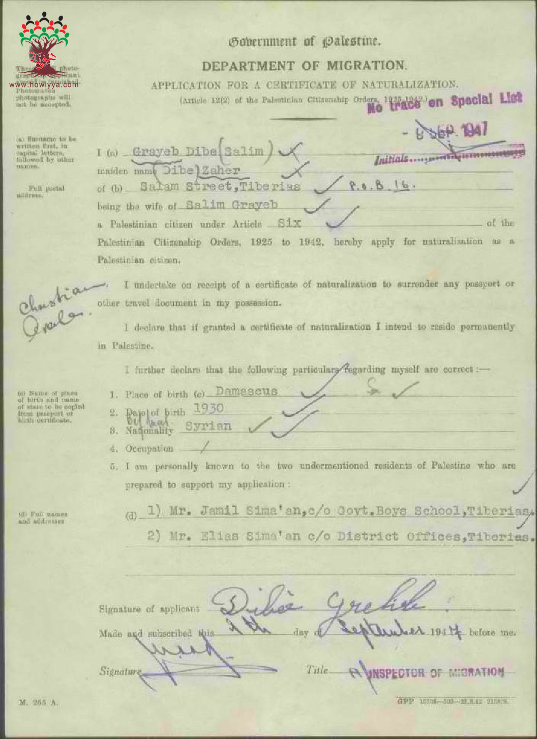 طلب الجنسية الفلسطينية - ديبة غريب - طبريا /سوريا