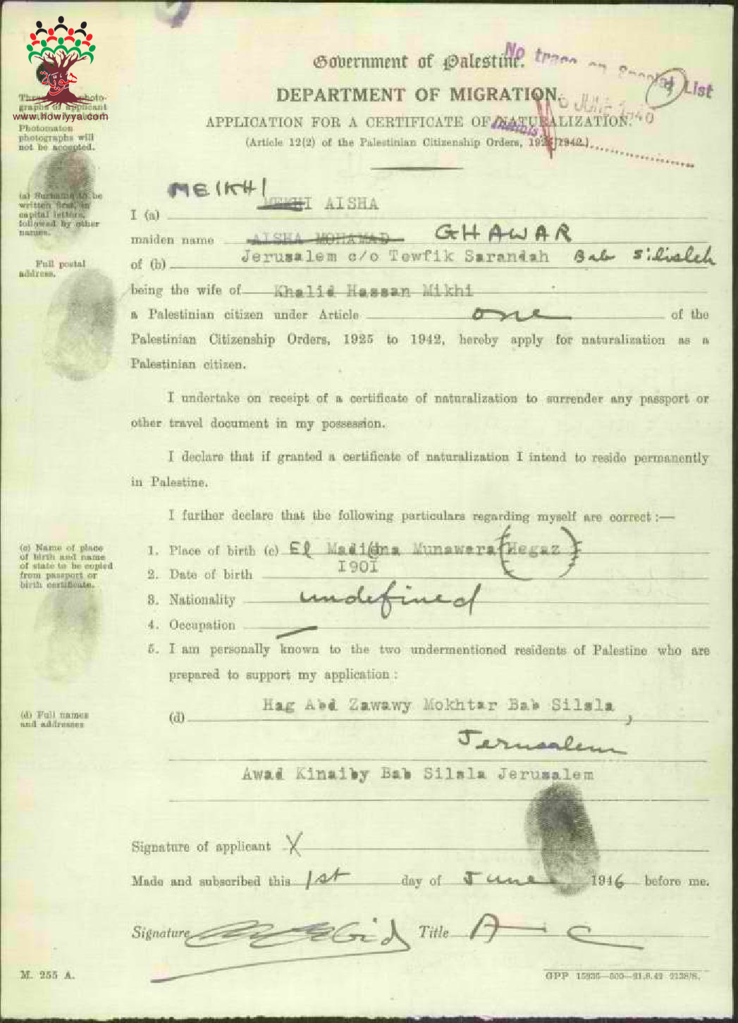 طلب الجنسية الفلسطينية - عائشة الميخي - القدس / السعودية