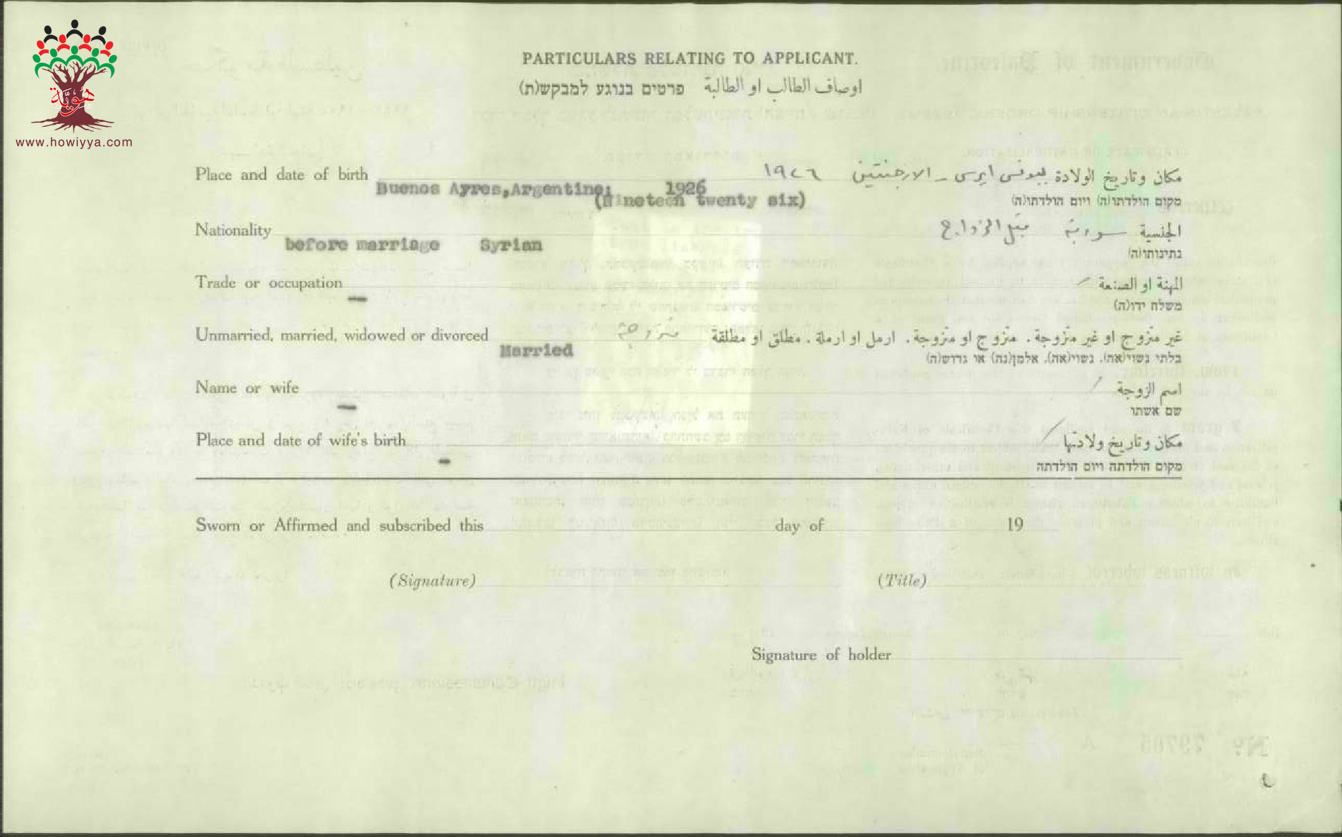 شهادة الجنسية الفلسطينية لعفيفة الفار (غطاس)