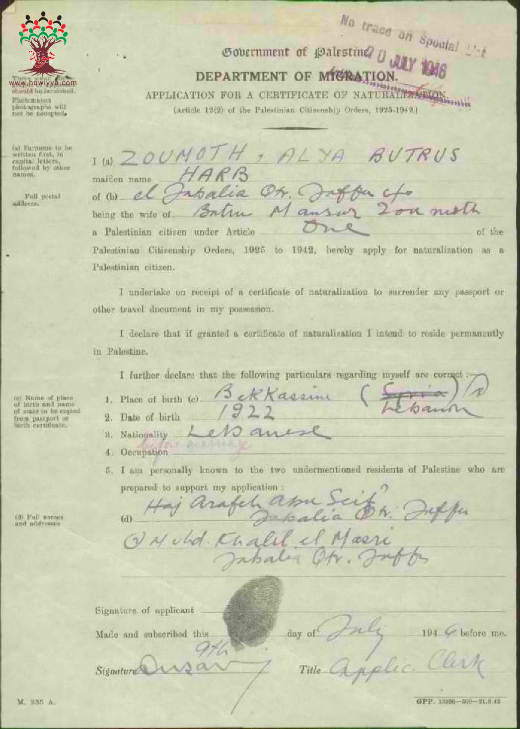 طلب الجنسية الفلسطينية - عليا بطرس زعمط - جباليا / لبنان