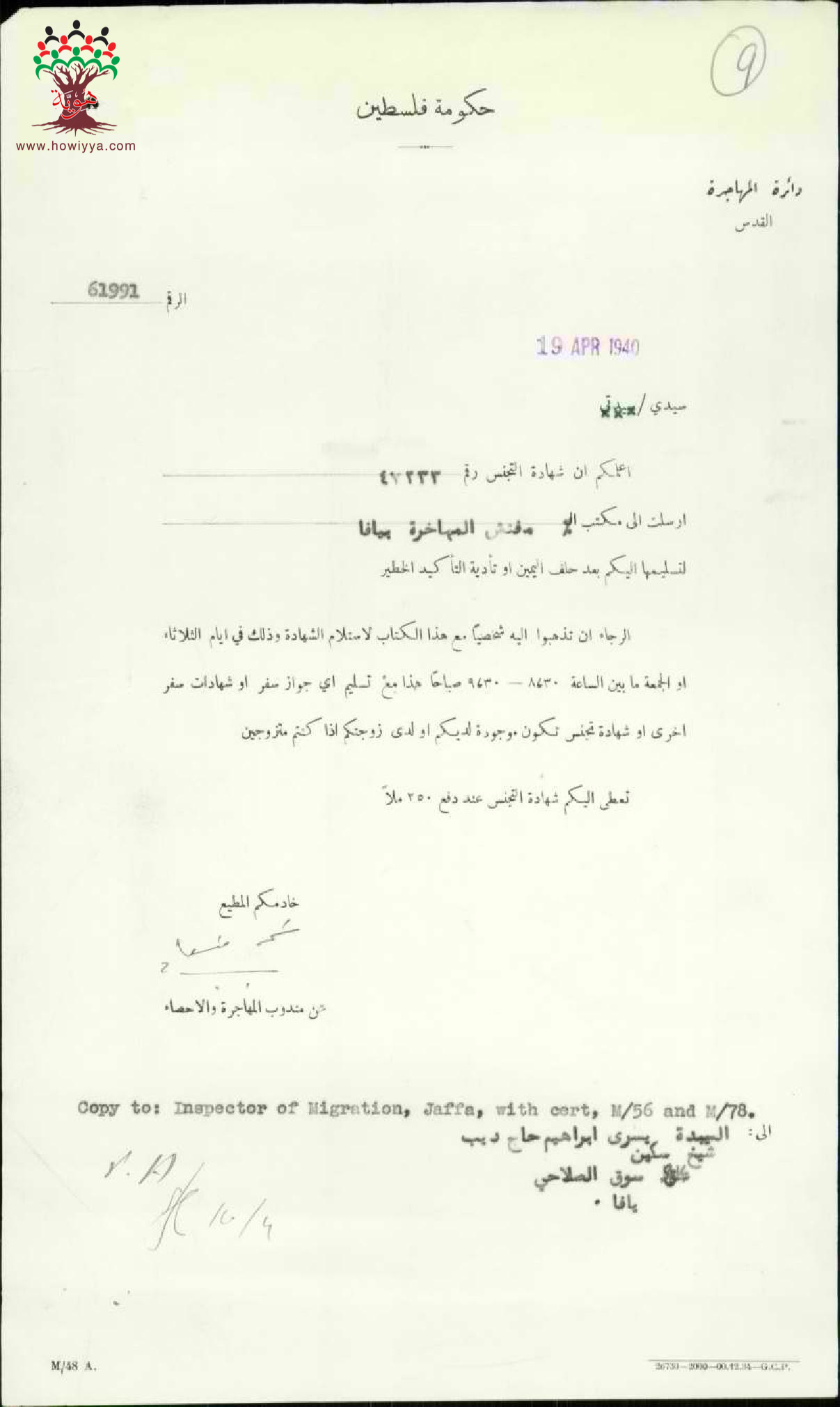 رسالة من دائرة المهاجرة للسيدة يسرى شيخ سكين بخصوص استلام شهادة الجنسية الفلسطينية