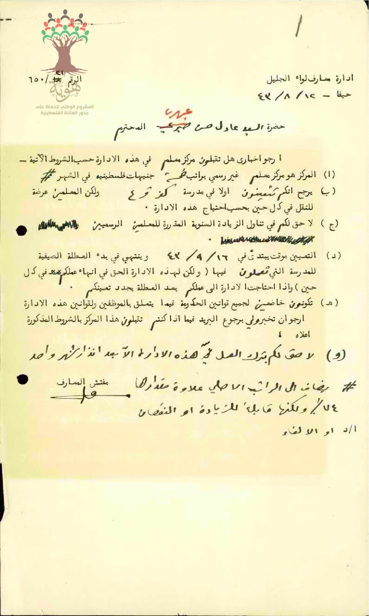 قرار تعيين عادل عبهري معلماً في مدرسة كفر قرع