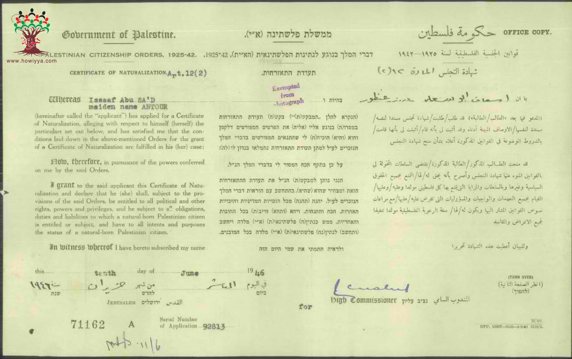شهادة الجنسية الفلسطينية لاسعاف أبو سعد