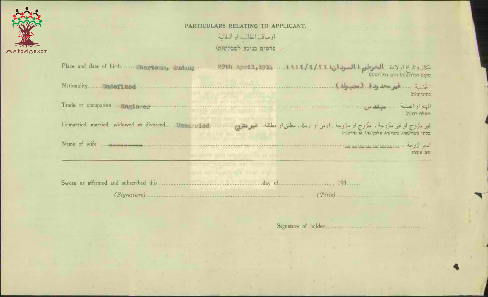 مواليد السودان في 29/4/1914 يعمل مهندس وغير متزوج