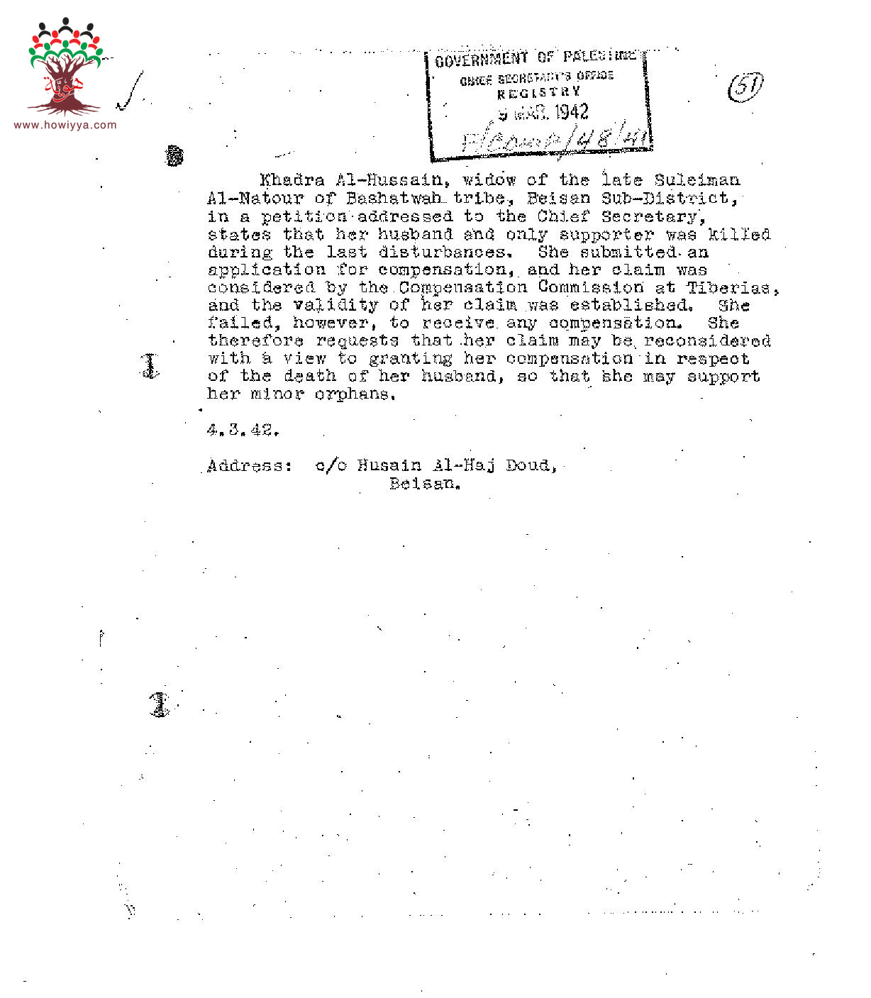 رسالة من خضرة الحسين إلى السكرتير العام تطلب تعويض عن وفاة زوجها