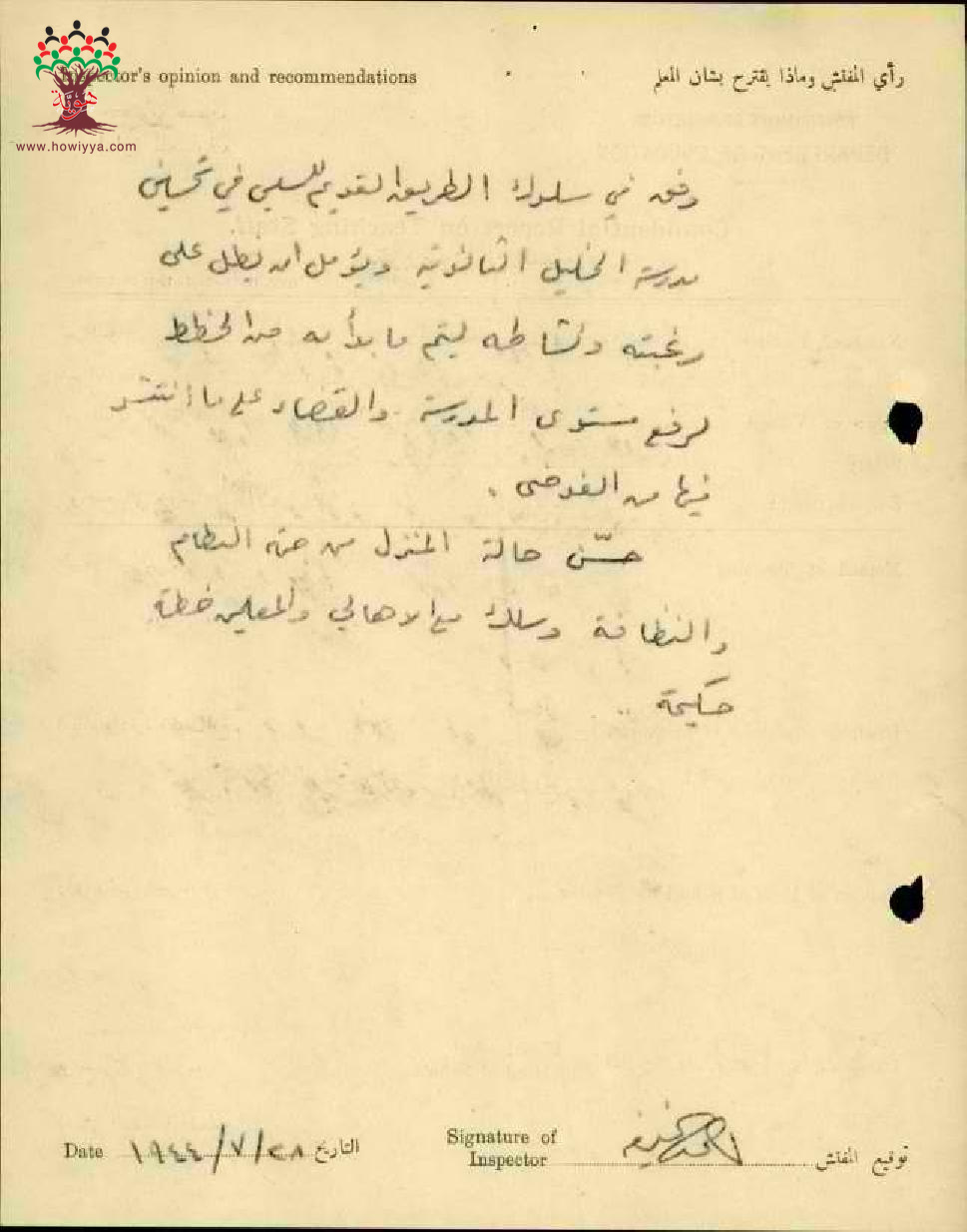 تقرير تفصيلي عن أداء المعلم راضي عبد الهادي في مدرسة الخليل سنة 1944