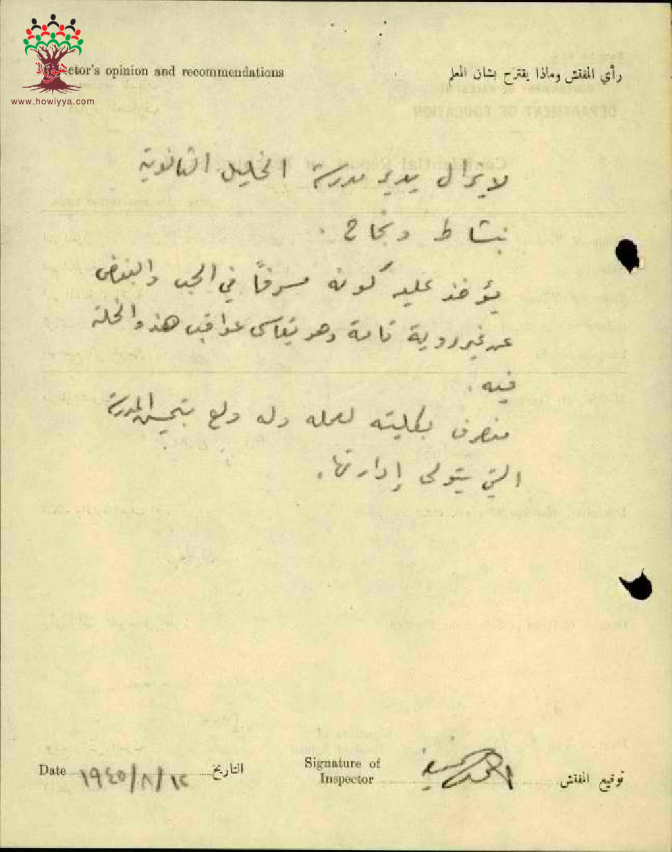 تقرير تفصيلي عن أداء المعلم راضي عبد الهادي في مدرسة الخليل سنة 1945