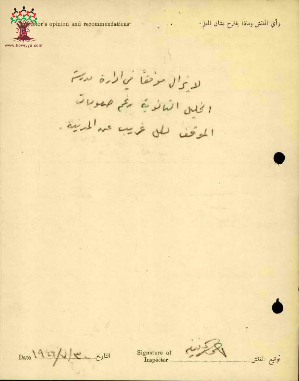 تقرير تفصيلي عن أداء المعلم راضي عبد الهادي في مدرسة الخليل سنة 1946