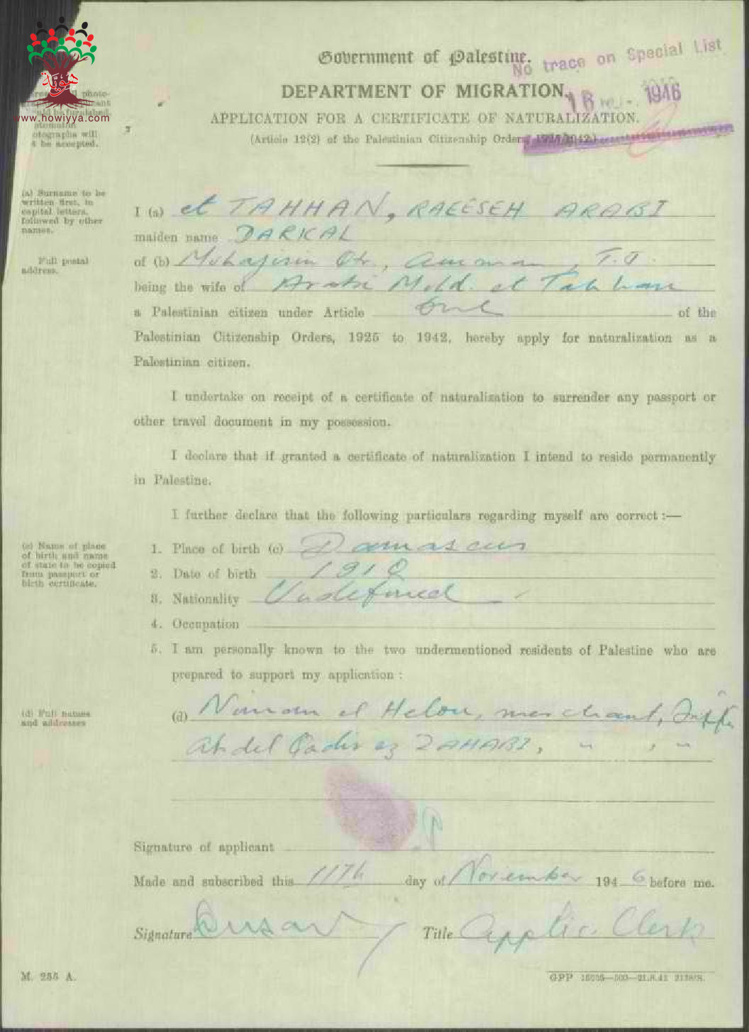 طلب الجنسية الفلسطينية-رئيسة طحان-يافا/سوريا
