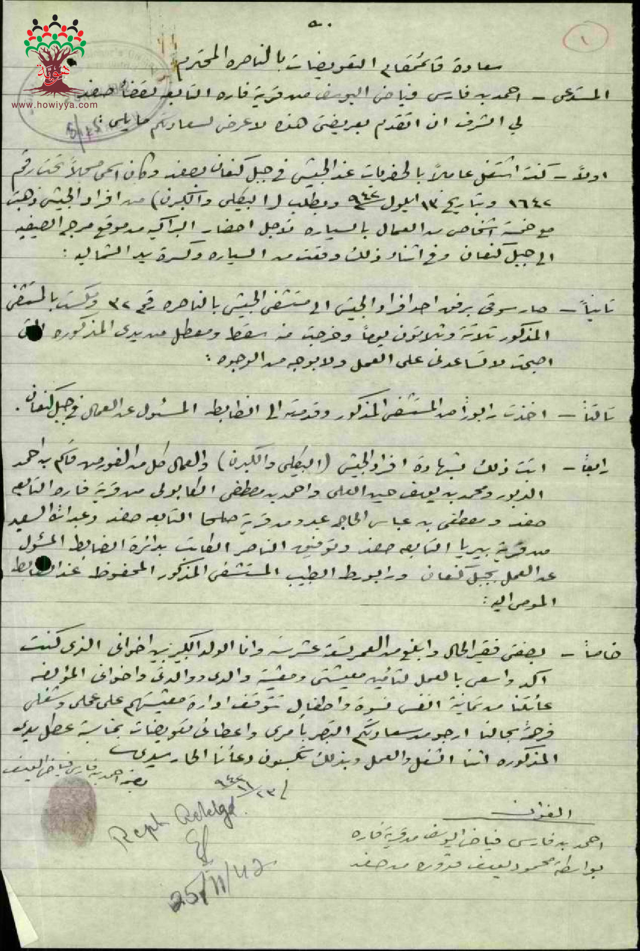 رسالة من أحمد فارس فياض اليوسف الى قائمقام التعويضات في الناصرة بخصوص حادثة كسر يده الشمال خلال وقوعه من السيارة أثناء العمل