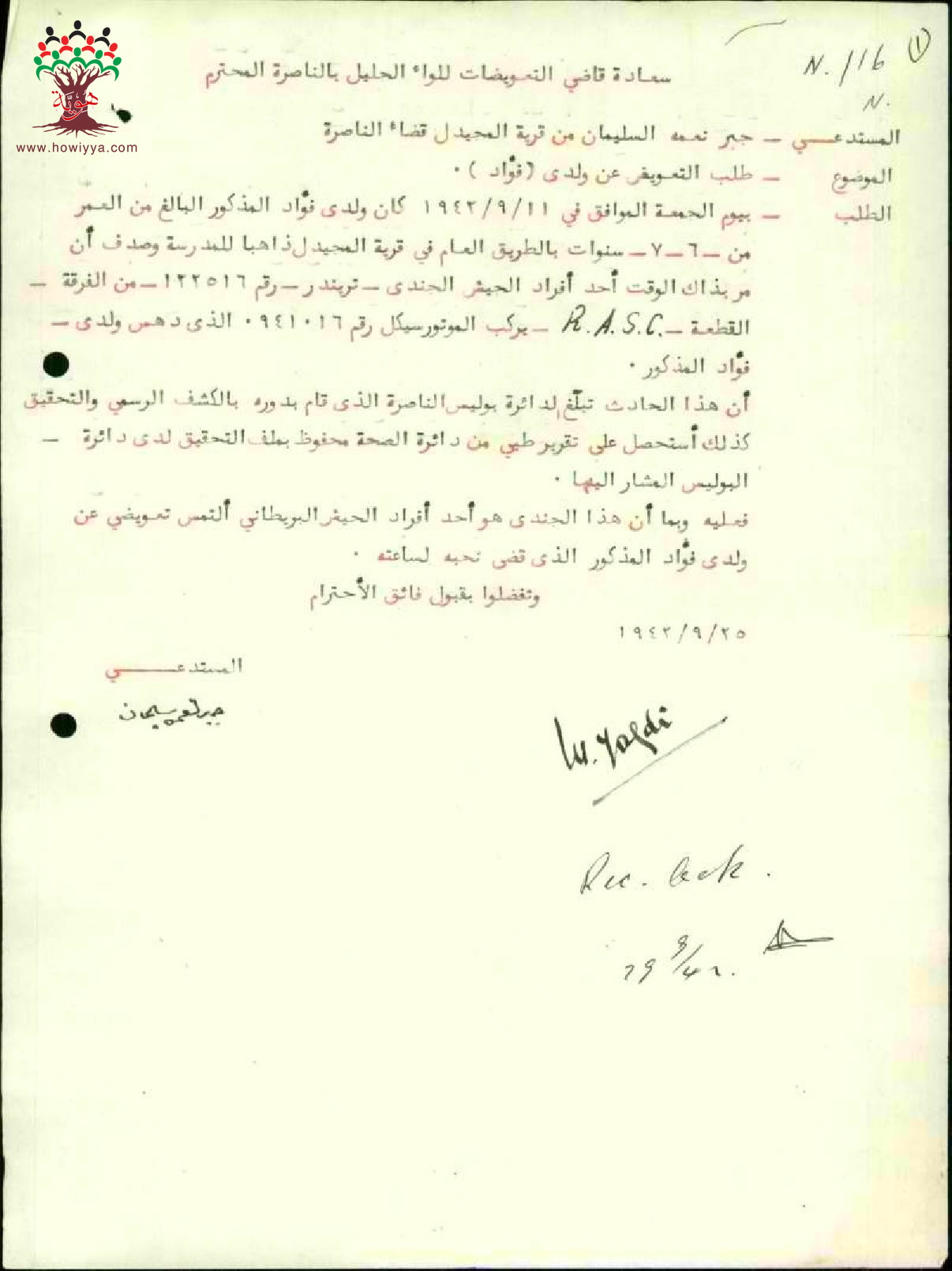 رسائل بخصوص مطالبة جبر نعمة سليمان التعويض عن حادثة دهس ابنه فؤاد وهو في طريقه الى المدرسة