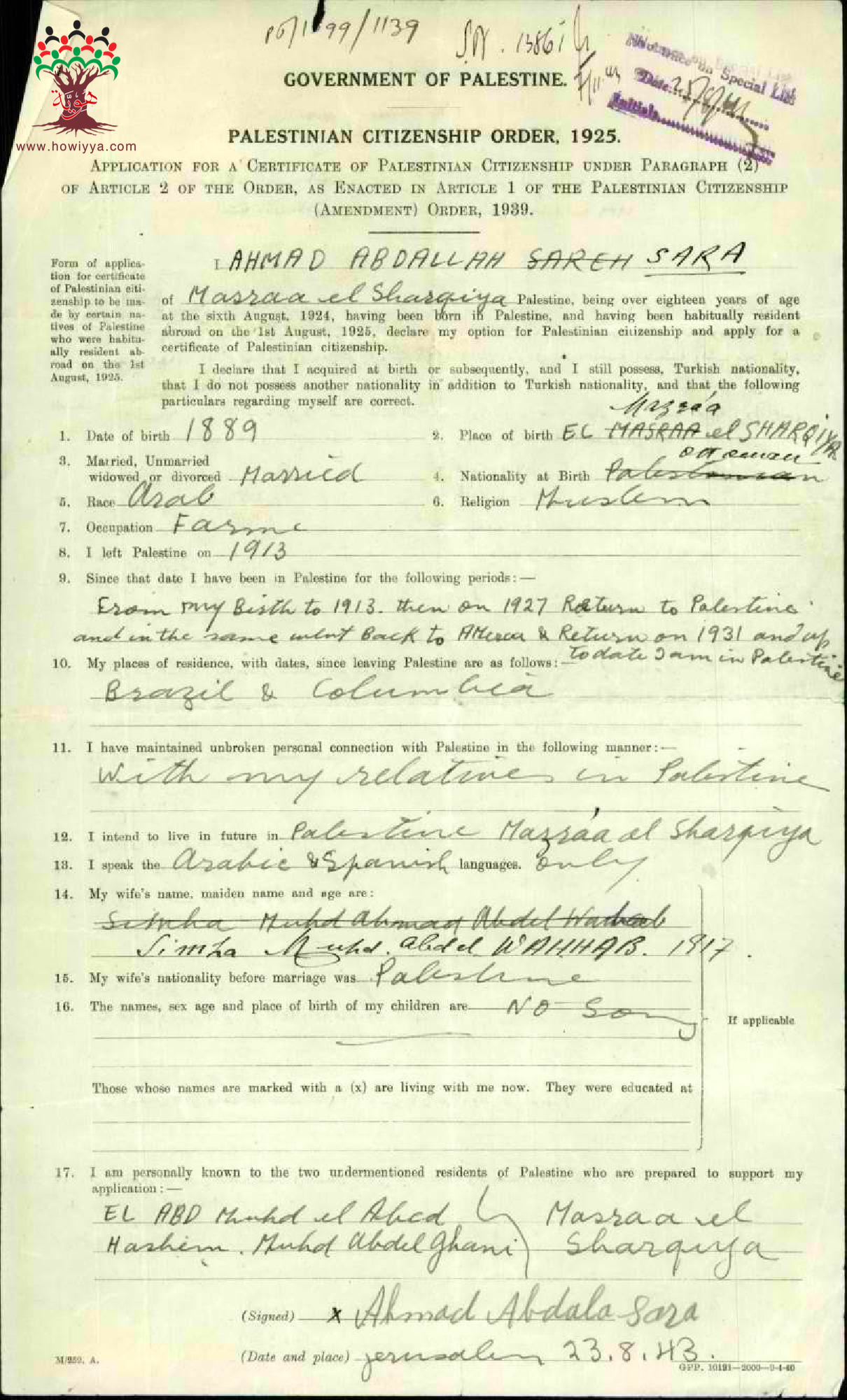طلب الجنسية الفلسطينية - أحمد عبد الله سارة - المزرعة الشرقية ..
