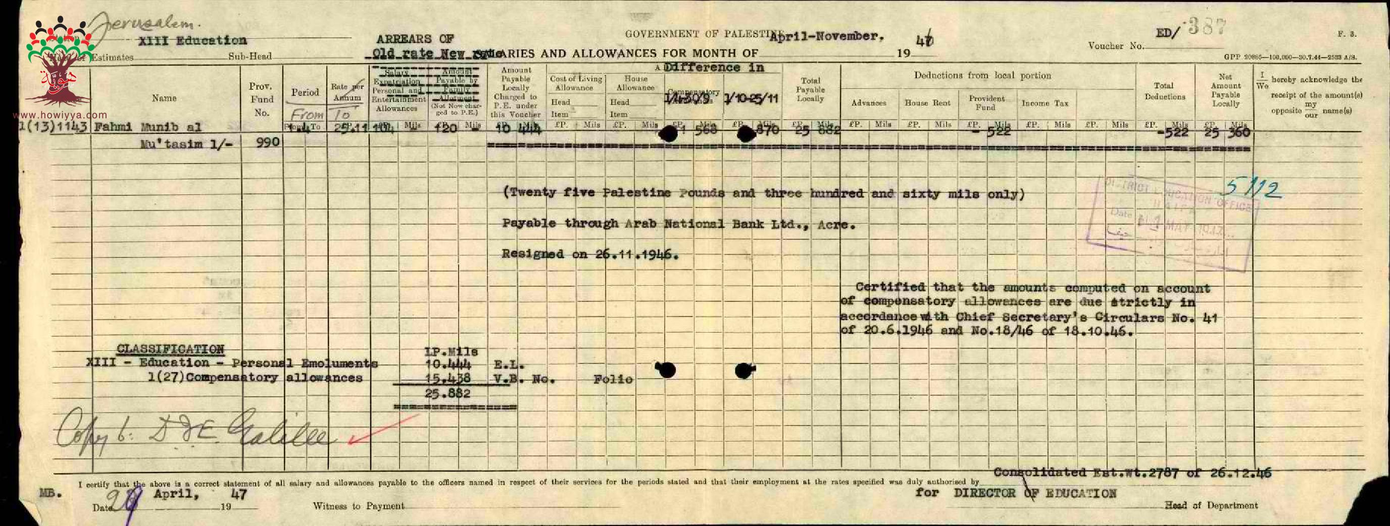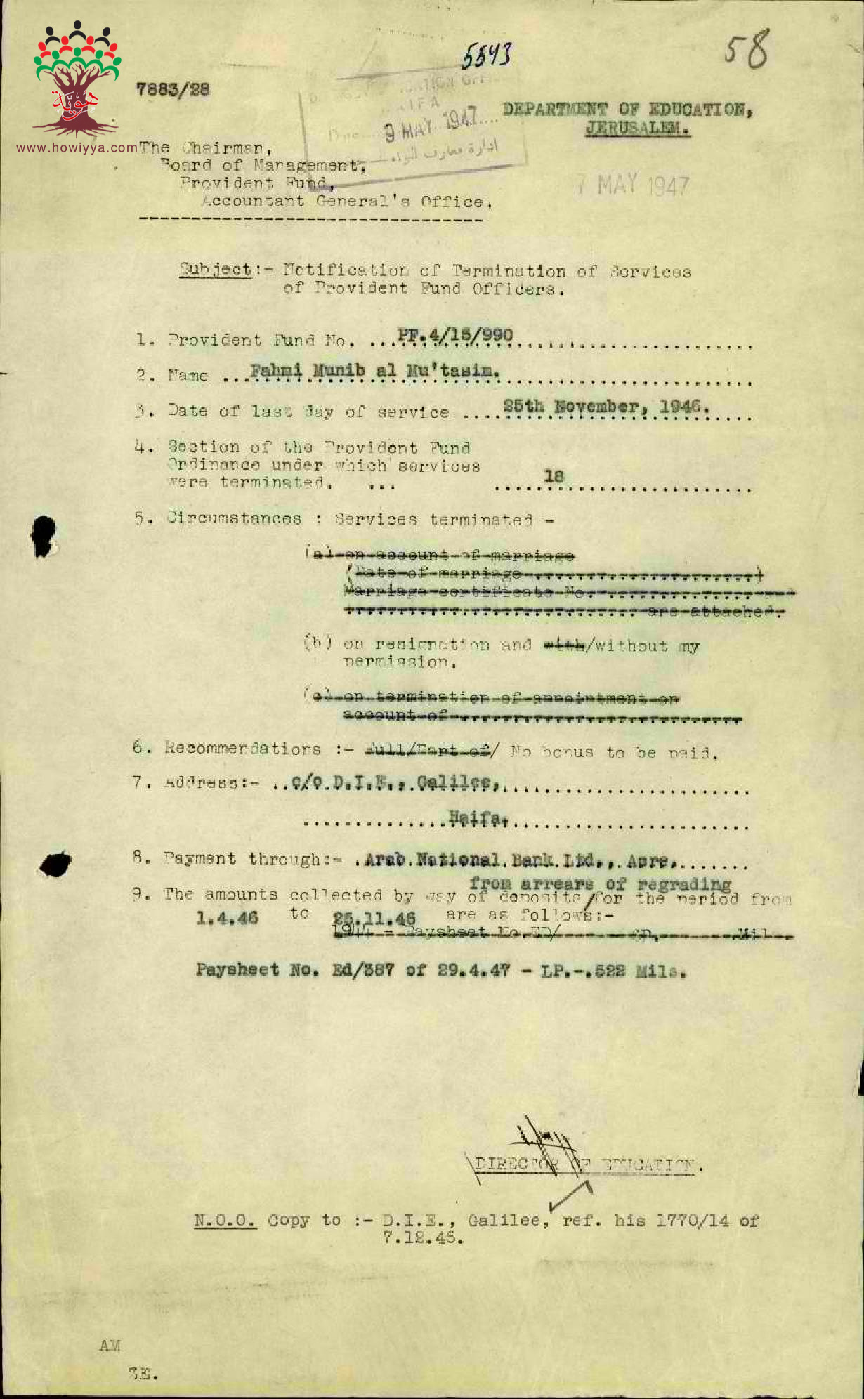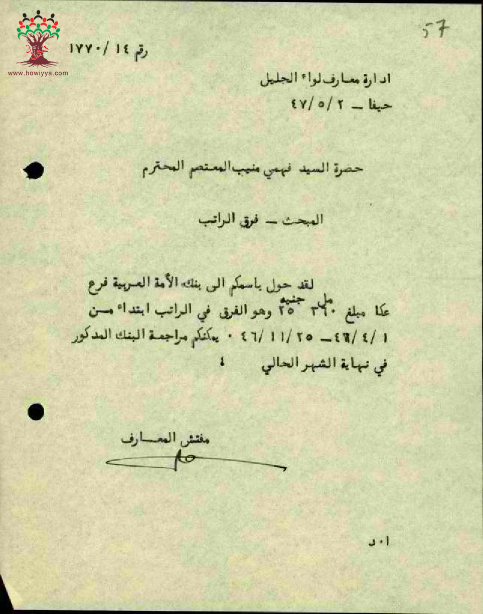 مجموعة رسائل وأوراق بخصوص تحويل راتب المعلم فهمي منيب معتصم الى بنك الأمة العربي