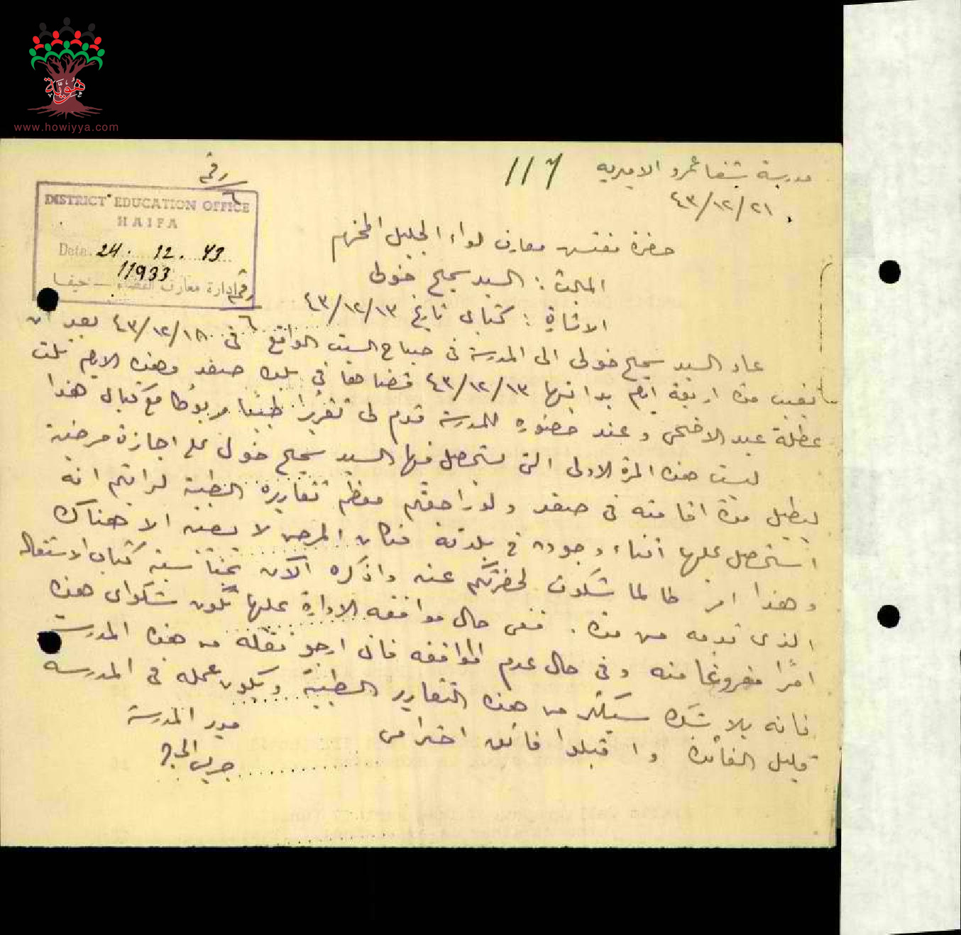 رسائل من مدير مدرسة شفا عمرو الى مفتش المعارف بخصوص تغيب المعلم سميح الخولي وعودته الى العمل