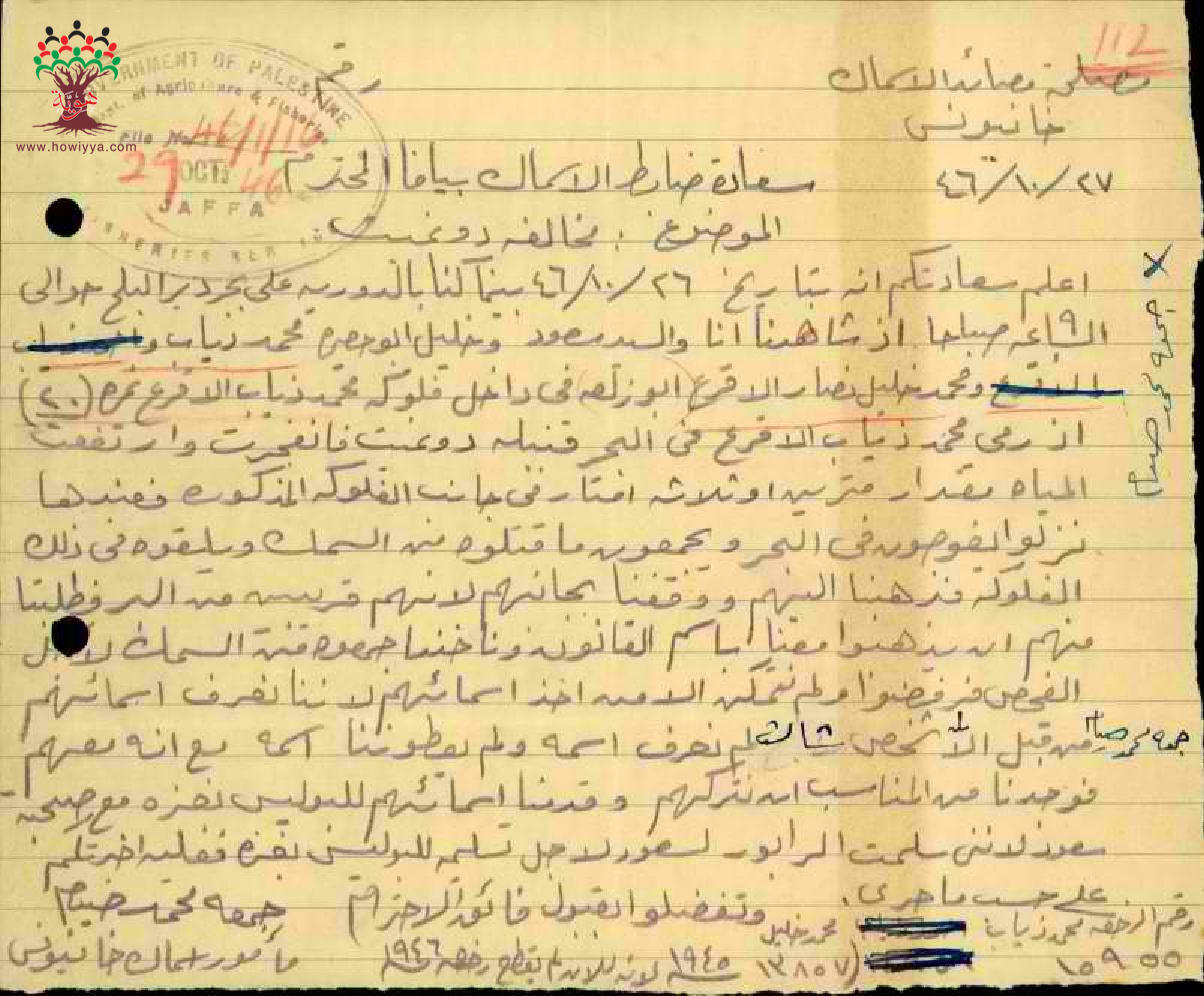 رسائل من مأمور أسماك اللواء الجنوبي الى مفتش مركز البوليس بخصوص مخالفة محمد ذياب الأقرع، ومحمد خليل نصار الأقرع لاستخدامهم الديناميت في الصيد