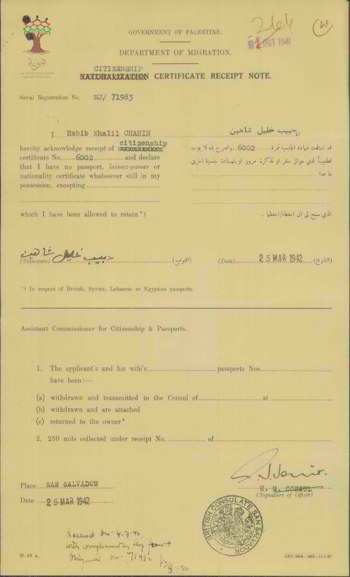 ايصال موقع من حبيب خليل شاهين باستلام شهادة الجنسية الفلسطينية