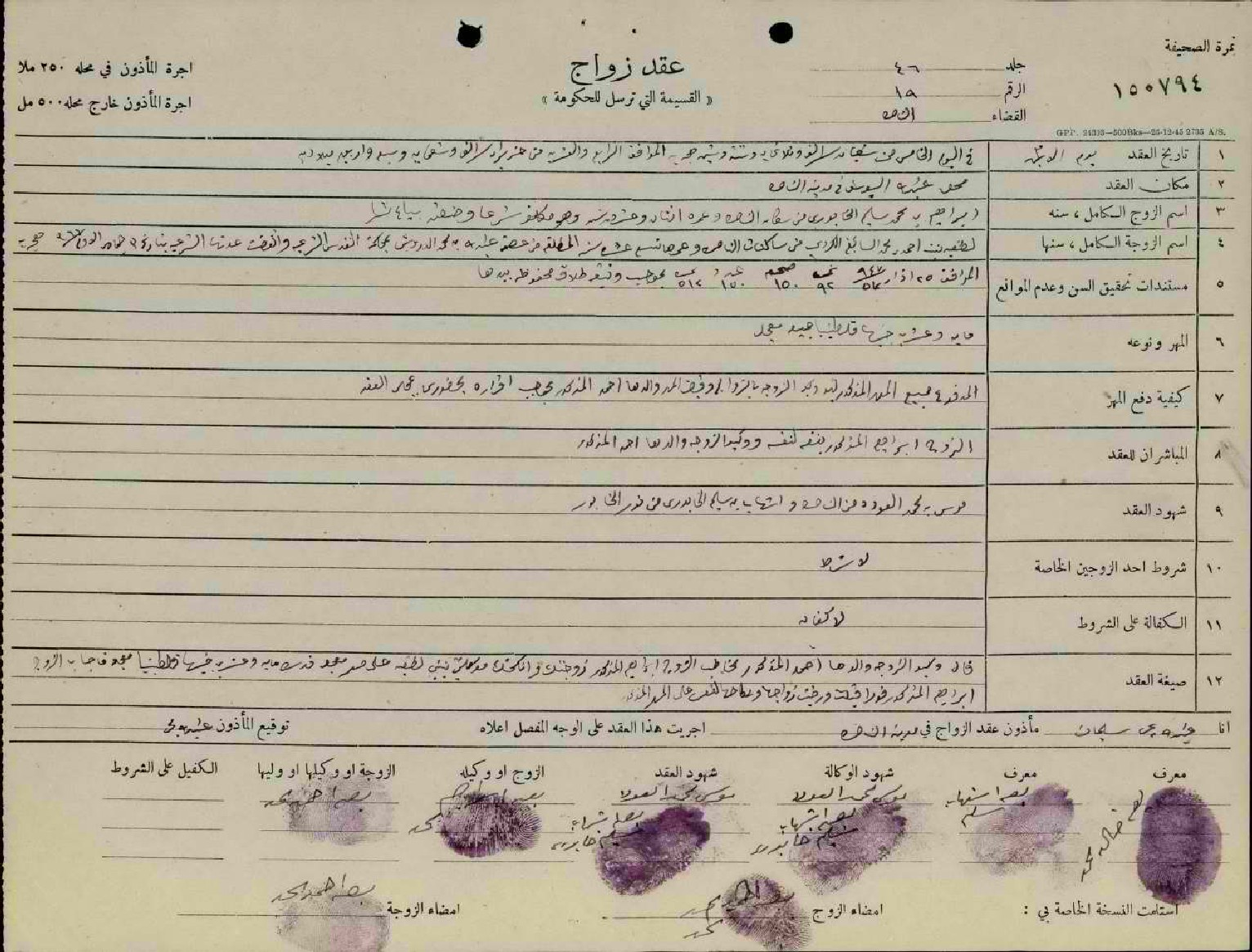 عقد زواج إبراهيم محمد الخابوري و لطفية أحمد الكردي