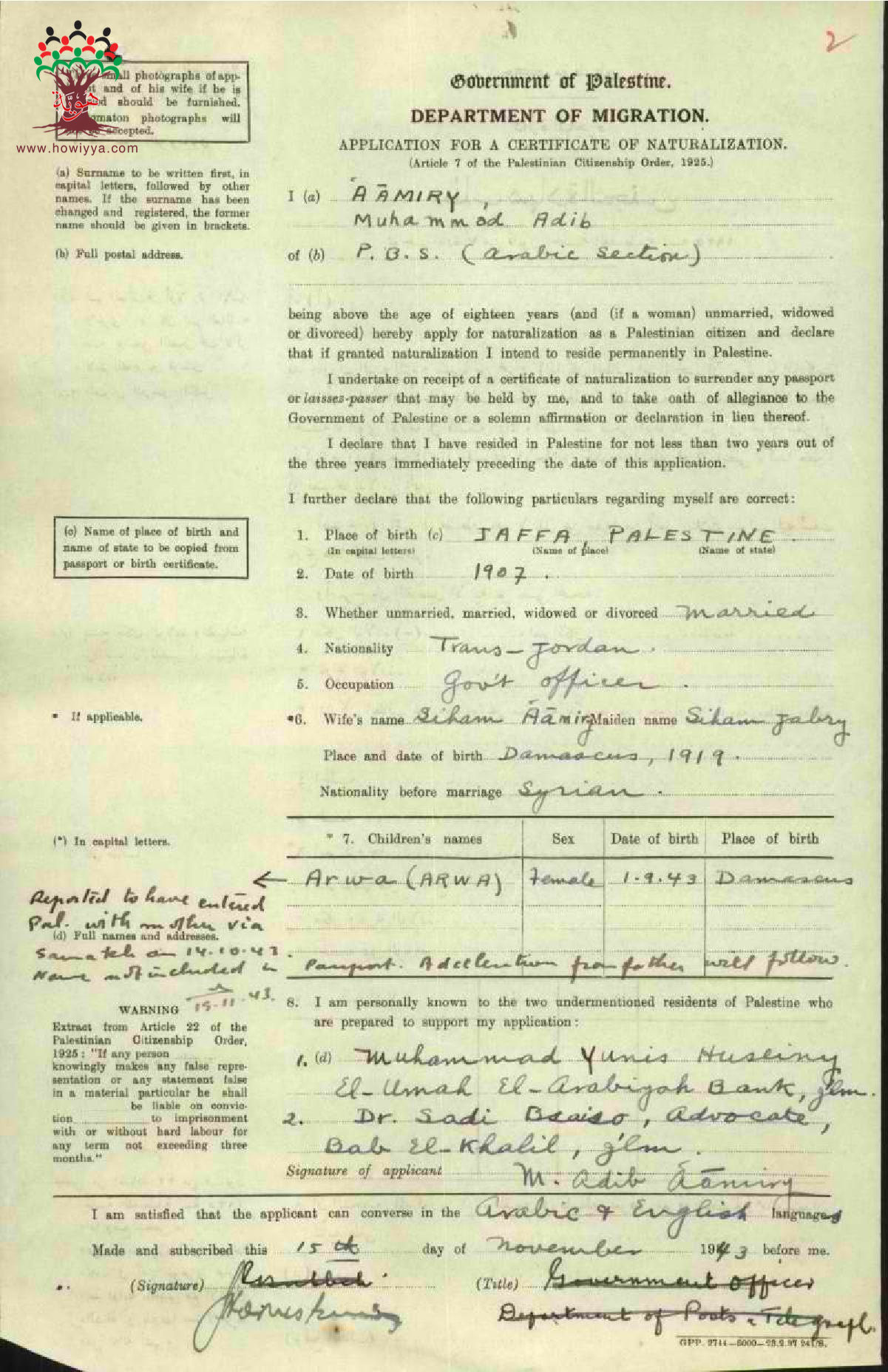 طلب الجنسية الفلسطينية-محمد أديب العامري-يافا/الأردن