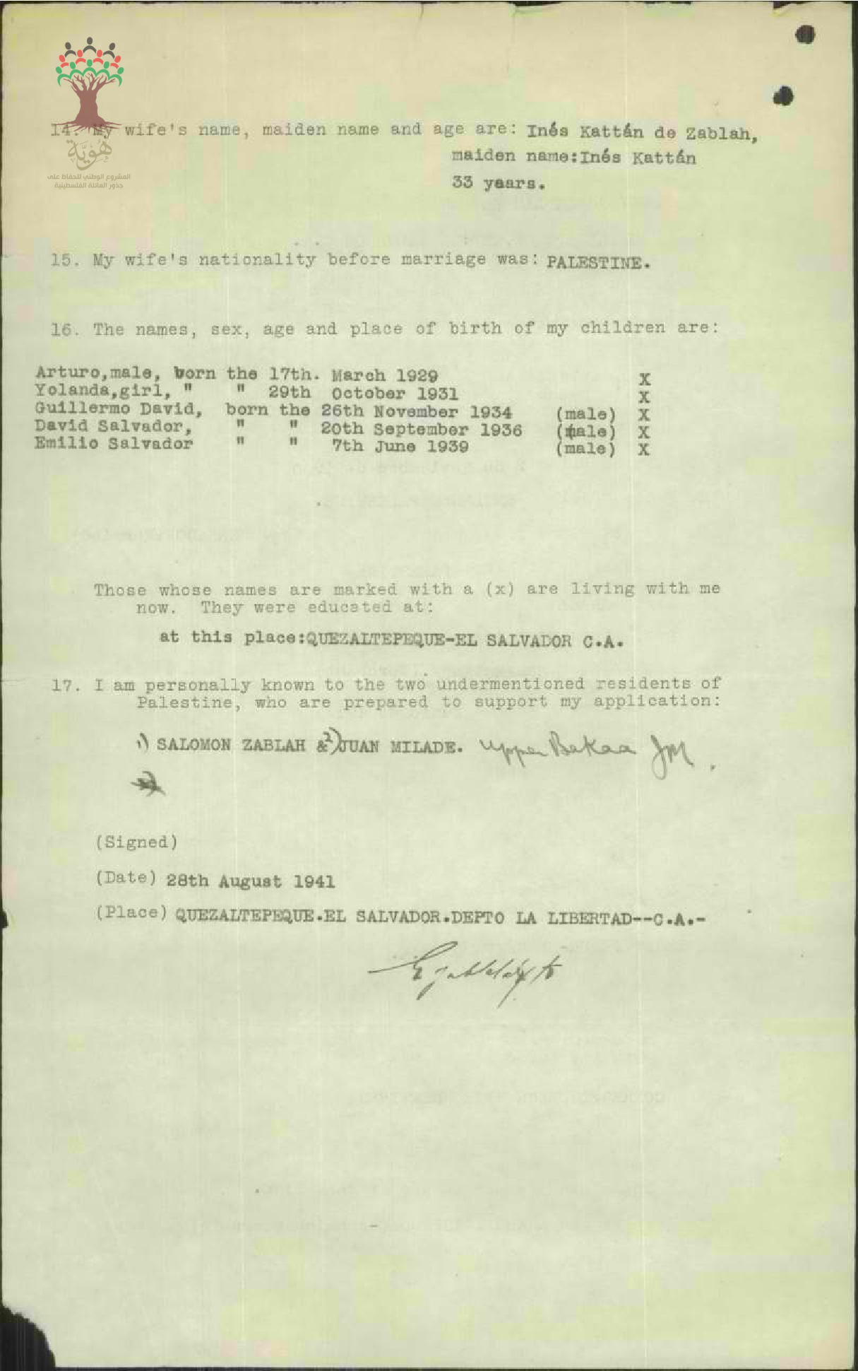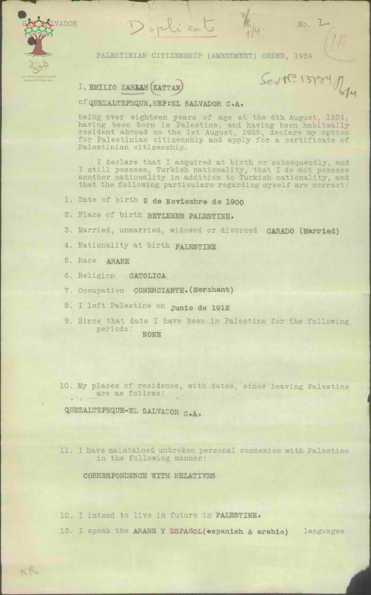 طلب الجنسية الفلسطينية - اميليو زبلح قطان- بيت لحم /السلفادور