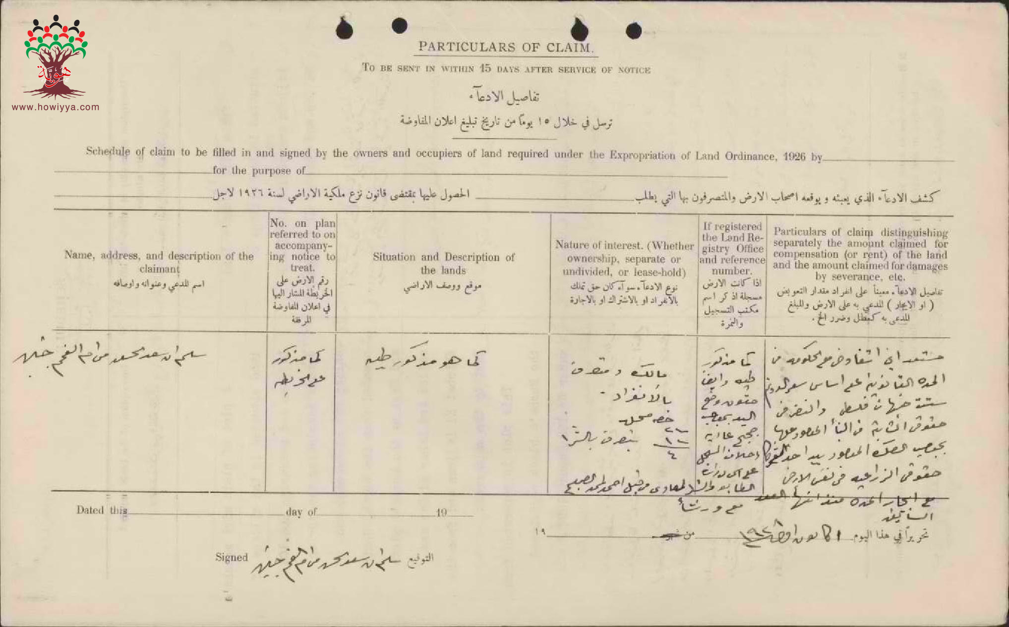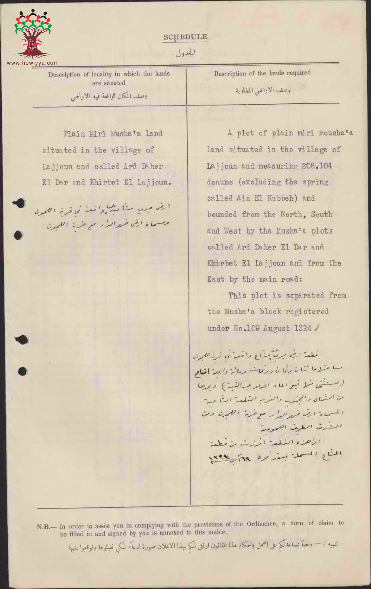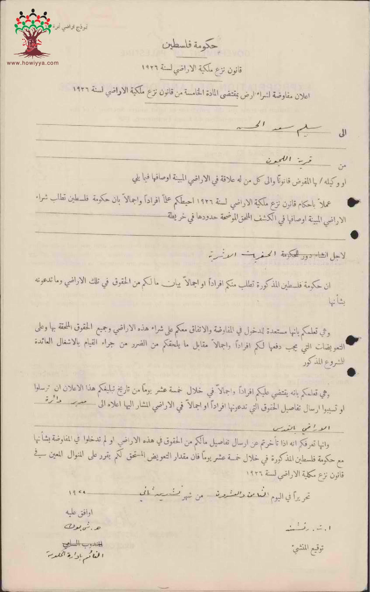 إعلان مفاوضة على شراء أرض بين الحكومة و سليم سعد الحسن في اللجون