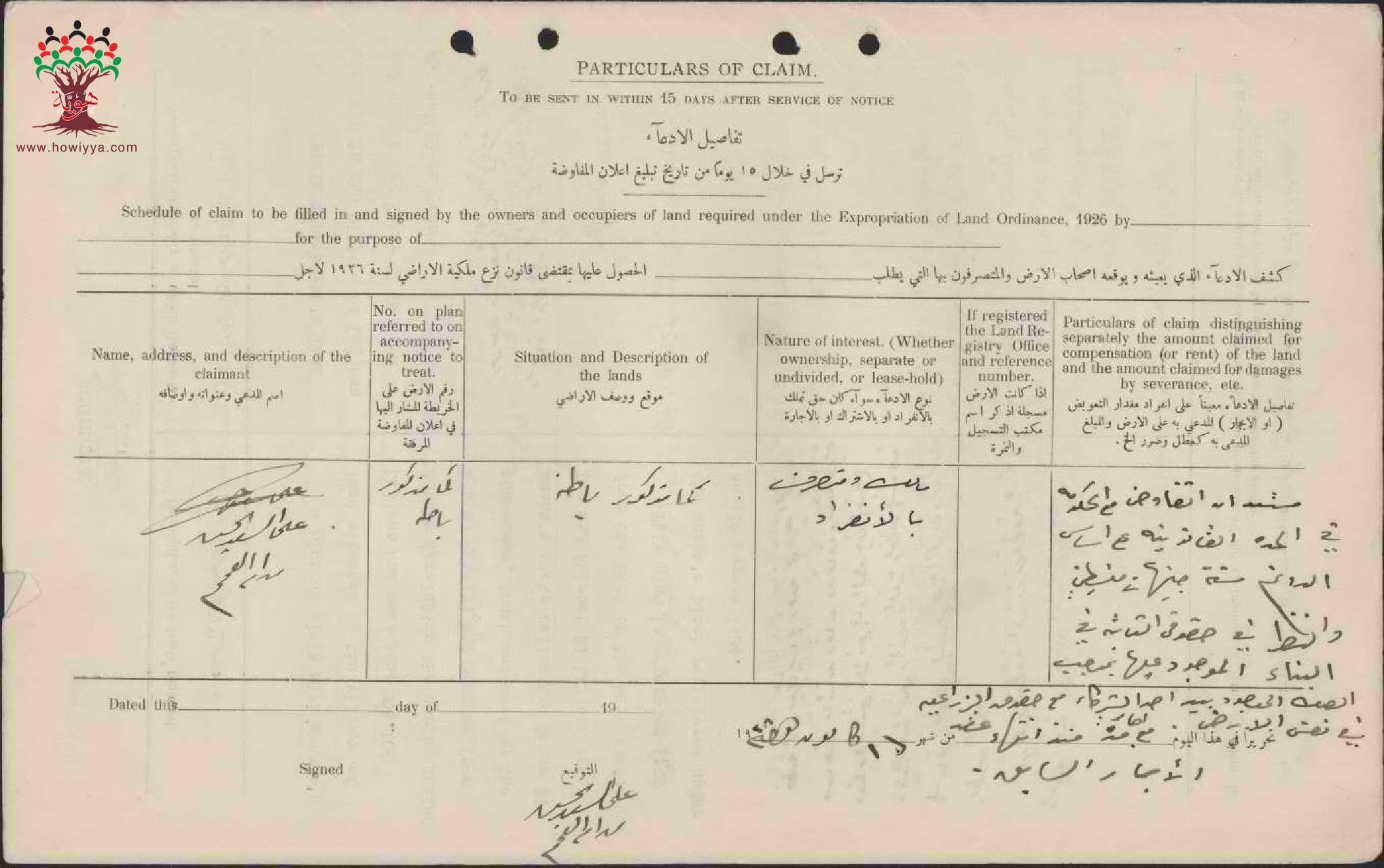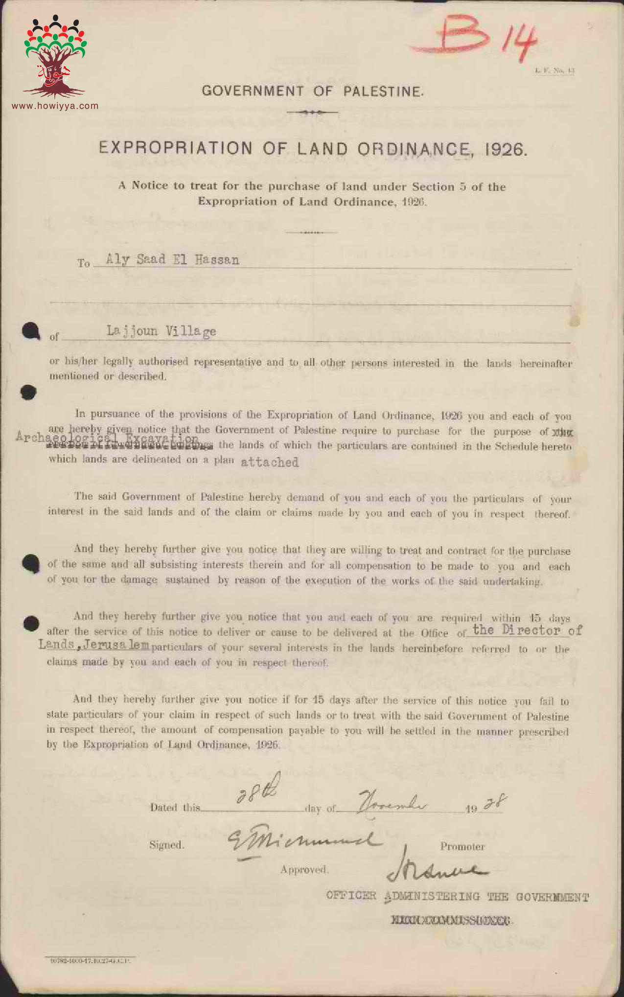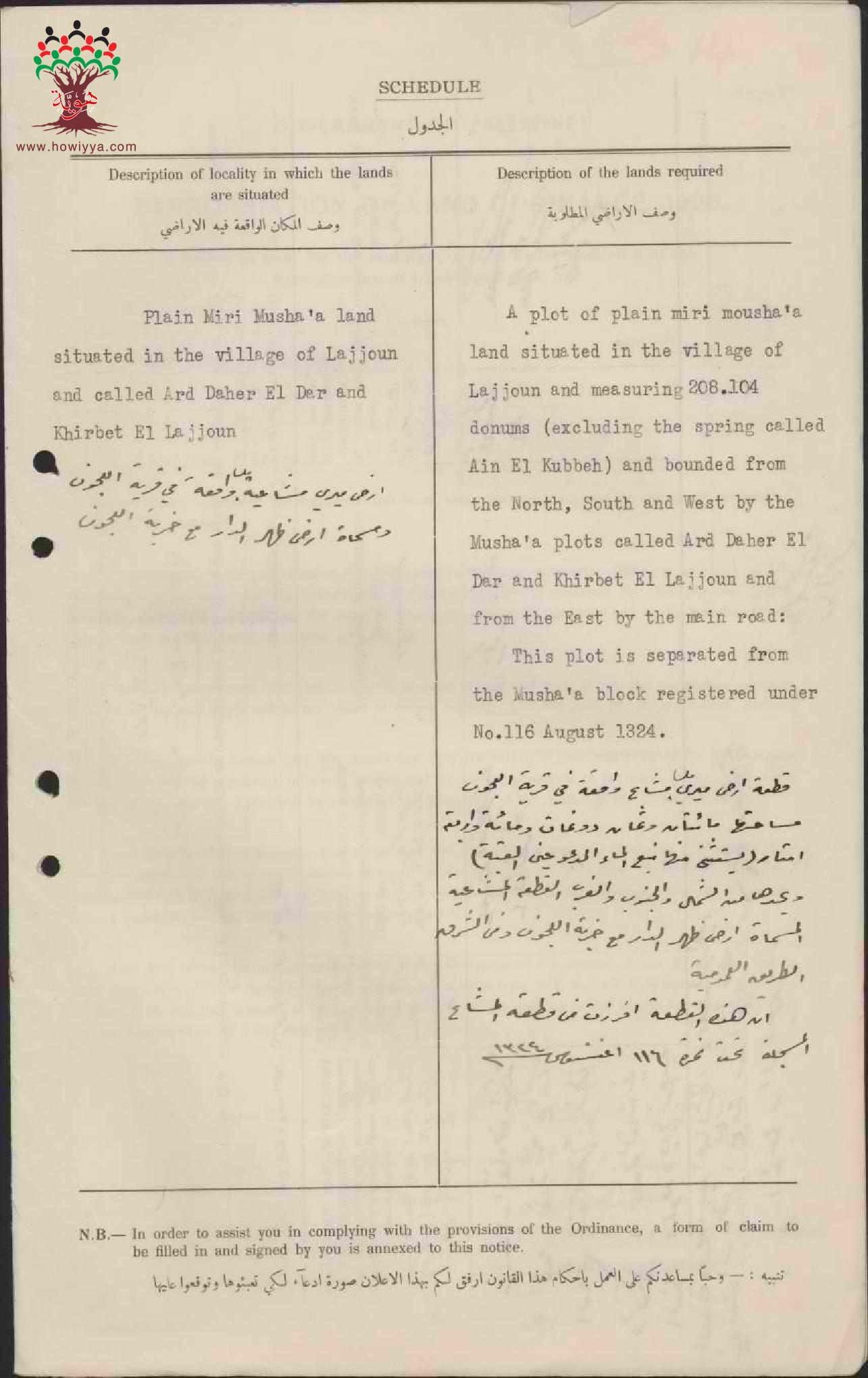 إعلان مفاوضة على شراء أرض بين الحكومة و علي سعد الحسن في اللجون