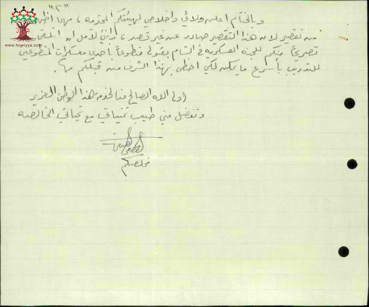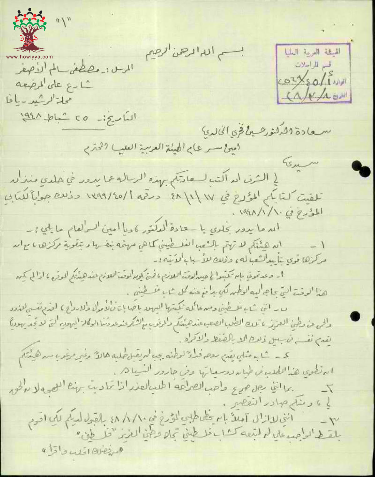 رسائل بين مصطفى الأصفر و أمين سر الهيئة العربية العليا يسأل فيها عن موعد الاستعانة بخدماته في خدمة فلسطين خاصة بأنه من عائلة تكبدت الكثير من الخسائر