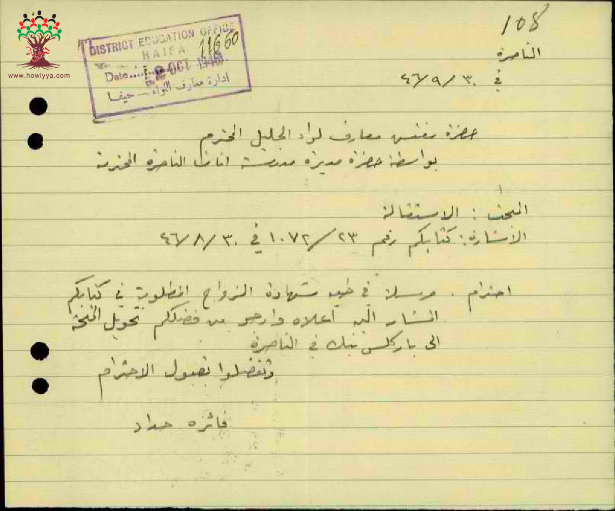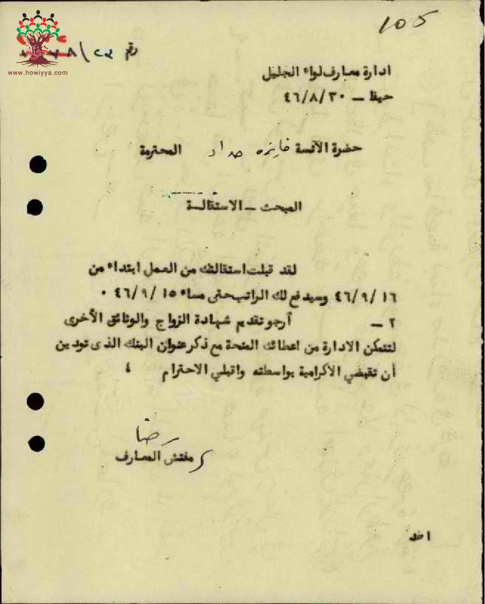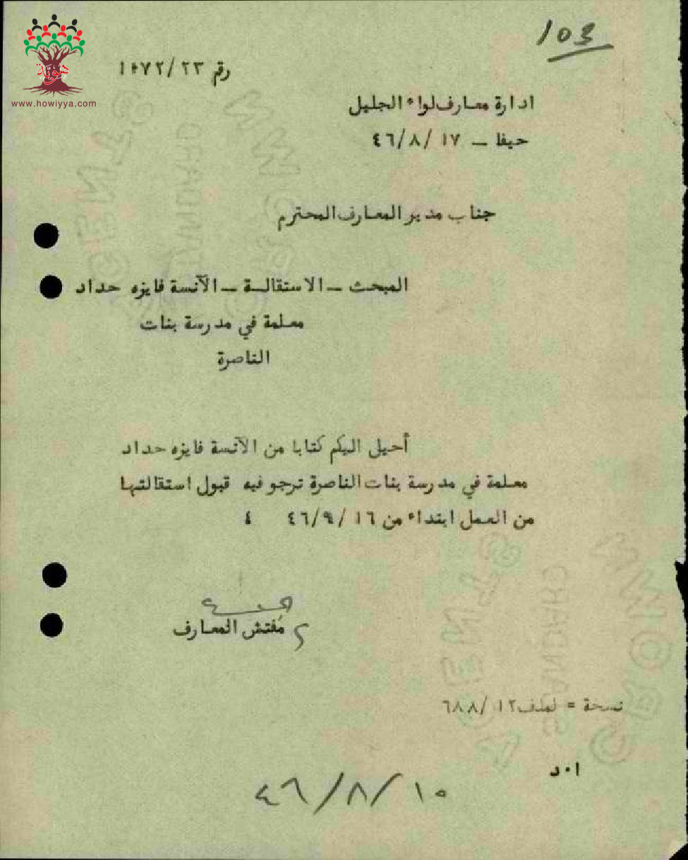 مجموعة رسائل بخصوص استقالة المعلمة فايزة حداد وارسال ورقة الزواج لمنحها الاكرامية